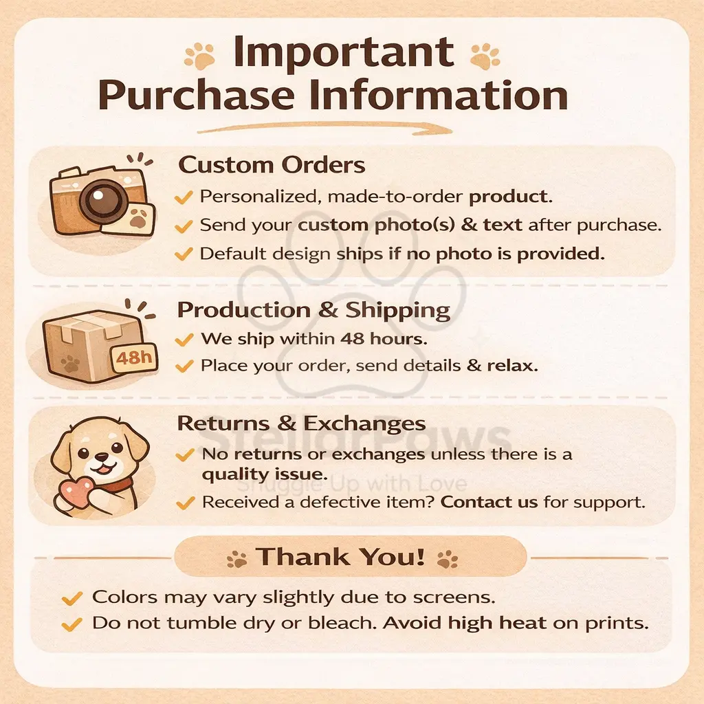 Our advanced heat-press technology ensures colors stay bright and details crisp wash after wash. Choose your favorite background color and size, then place your order. Send your details via "Message Seller" or "Contact Customer Service." Our designers will create your design and ship it in record time. Orders are processed in 1-2 business days, with most shipping within 48 hours after design approval.