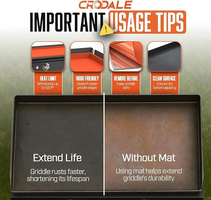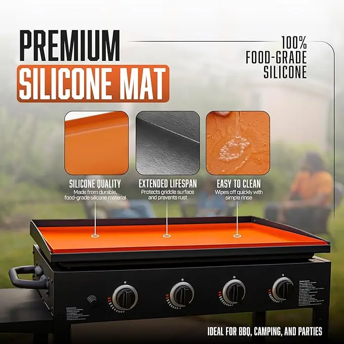 ·【Handles Heat Like a Champ】With heat resistance up to 500°F, this mat stays safe to use around active cooking areas. It won’t melt, warp, or stick, and it keeps its shape season after season. Whether you use your griddle daily or only on weekends, you get the peace of mind that it will hold up in real outdoor conditions