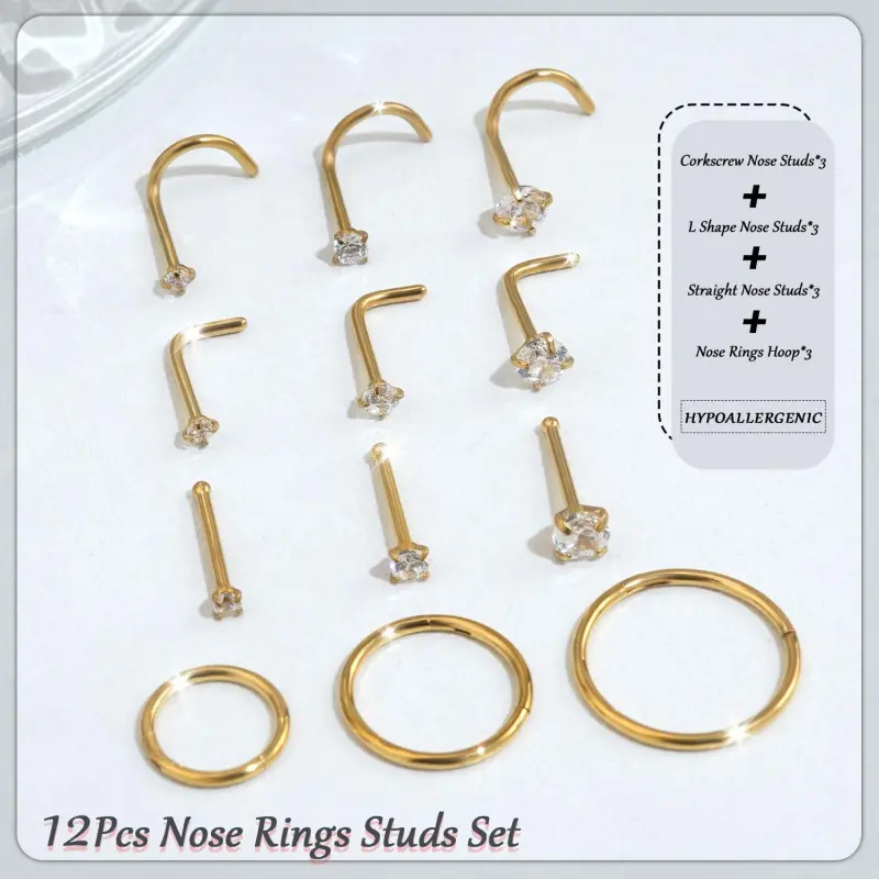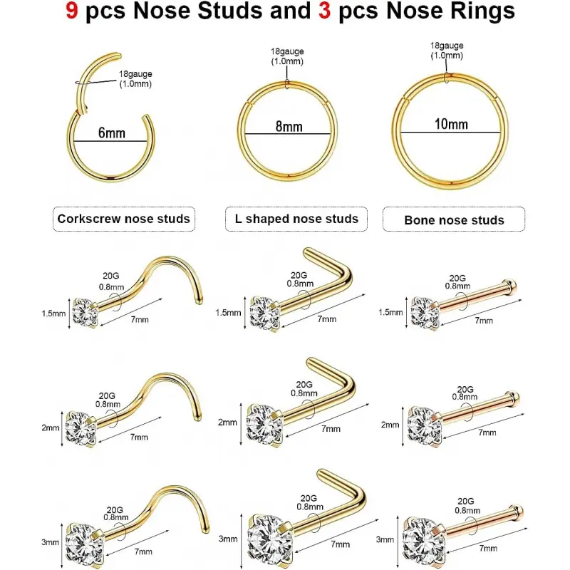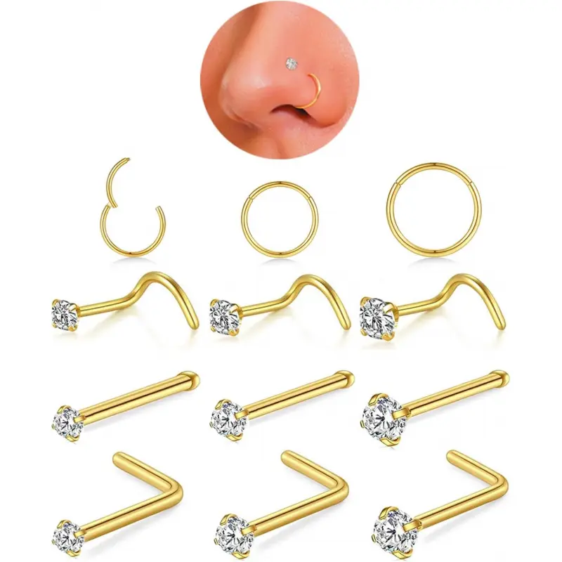 Gold nose ring set has various styles, include gold nose studs, gold nose rings hoops, L shape nose rings gold.which can meet different matching styles and needs in daily life.