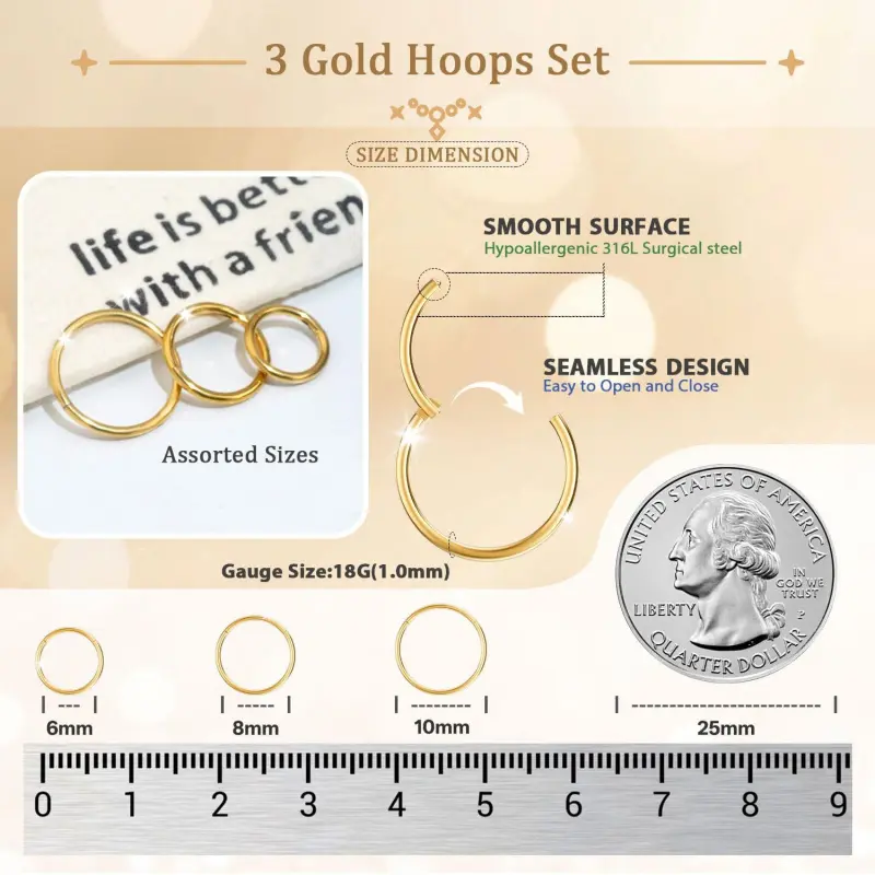 Our gold hoop nose rings are exquisite, good quality and low price, you can give them as gifts to your family or friends. It's the perfect gift for Birthday, Christmas Day, Anniversary Day, Valentine's Day and more