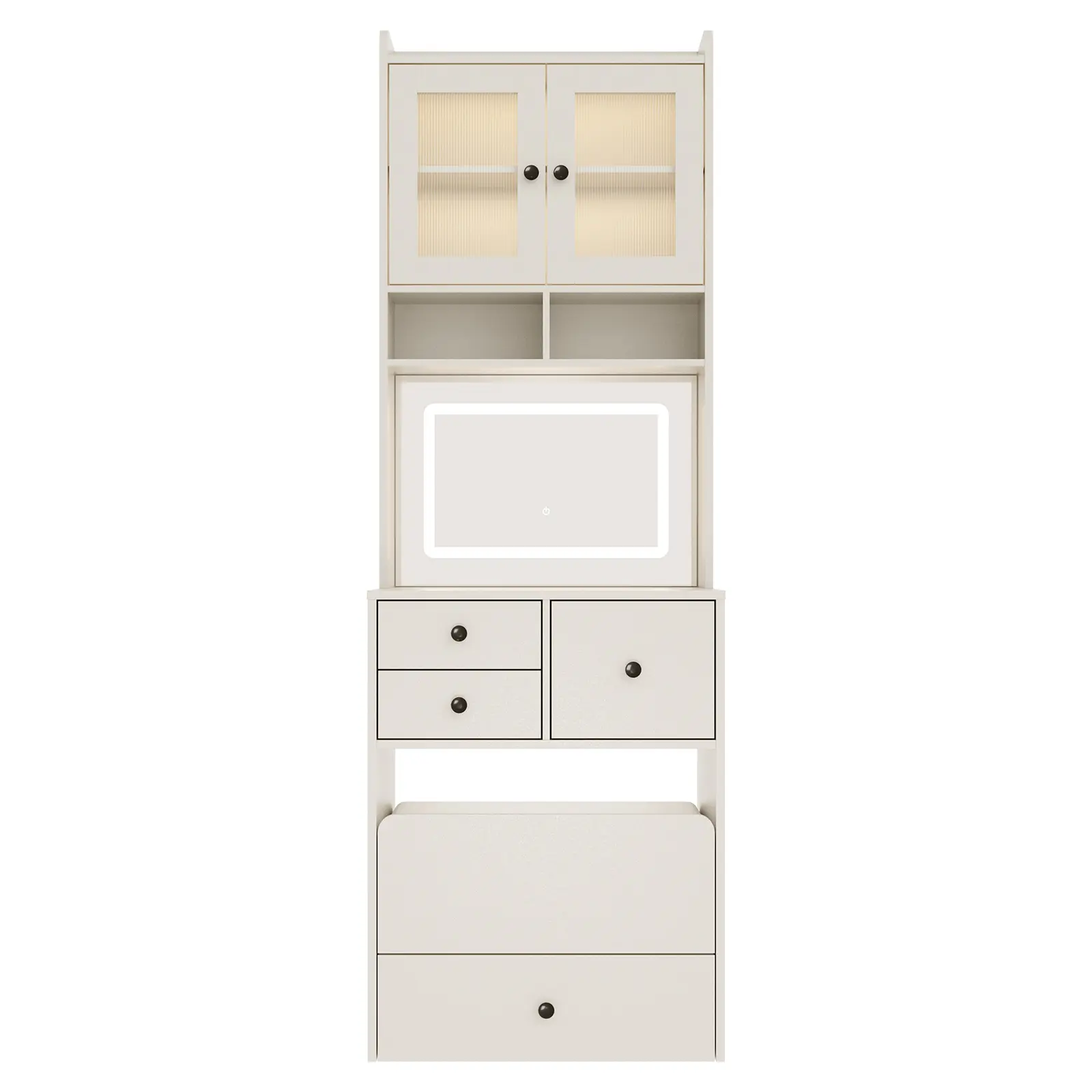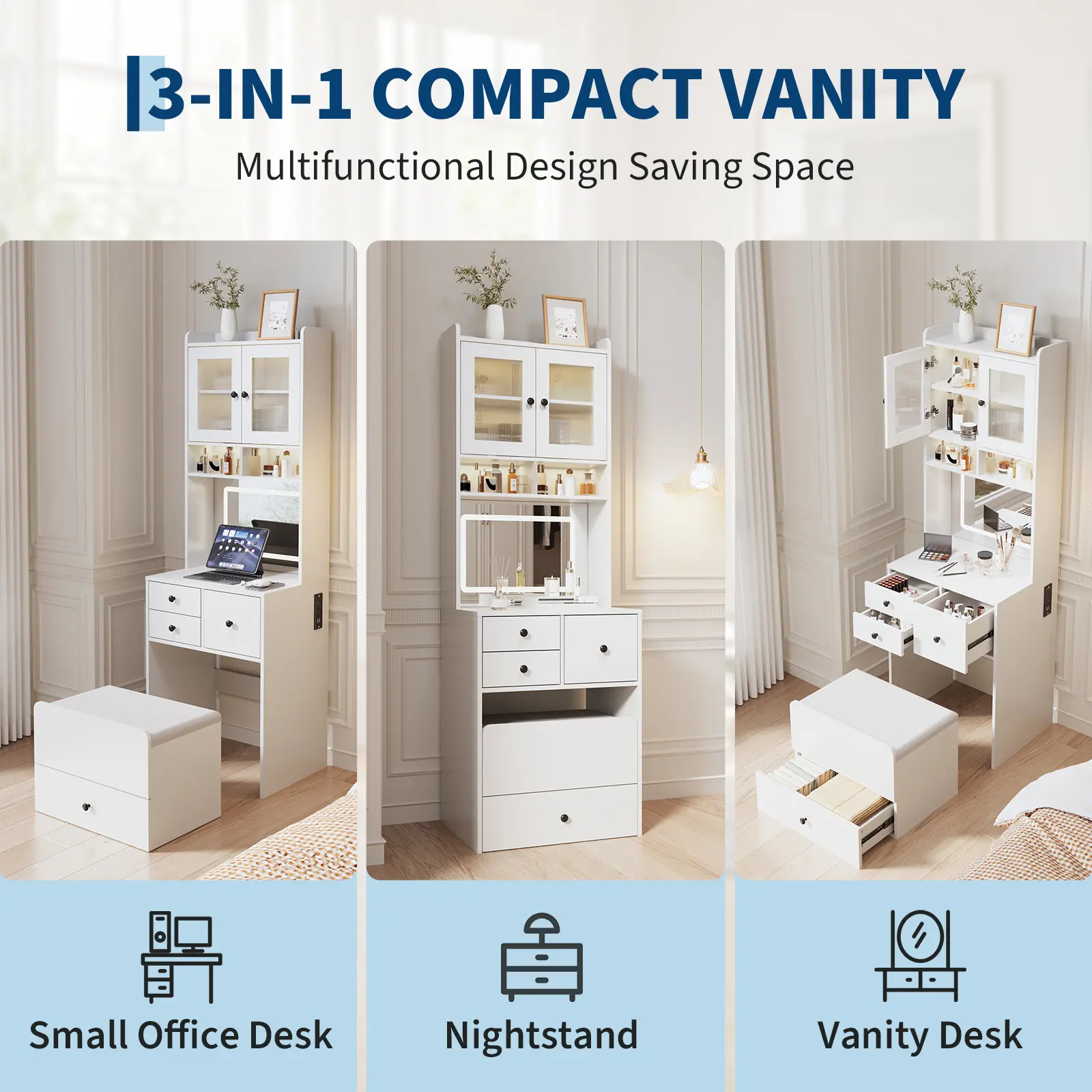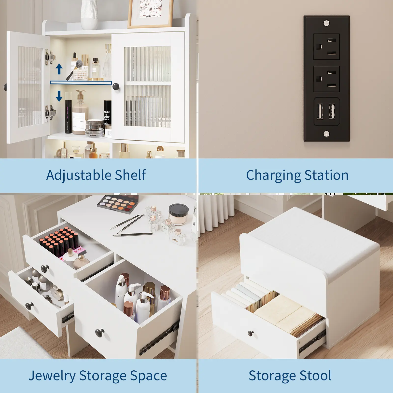 ·Ample Storage: Four spacious drawers and a cabinet keep cosmetics, brushes, and accessories neatly organized and clutter-free. The included cushioned stool doubles as hidden storage, maximizing utility in tight spaces.