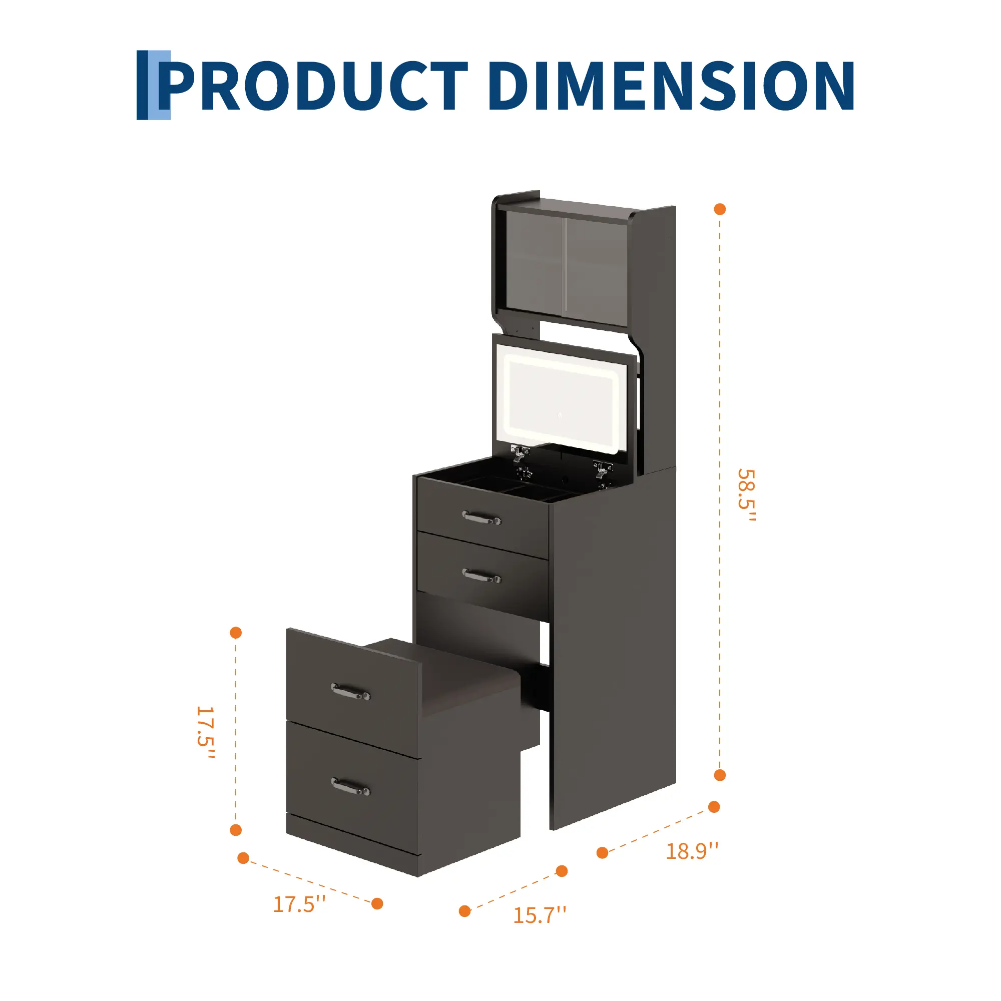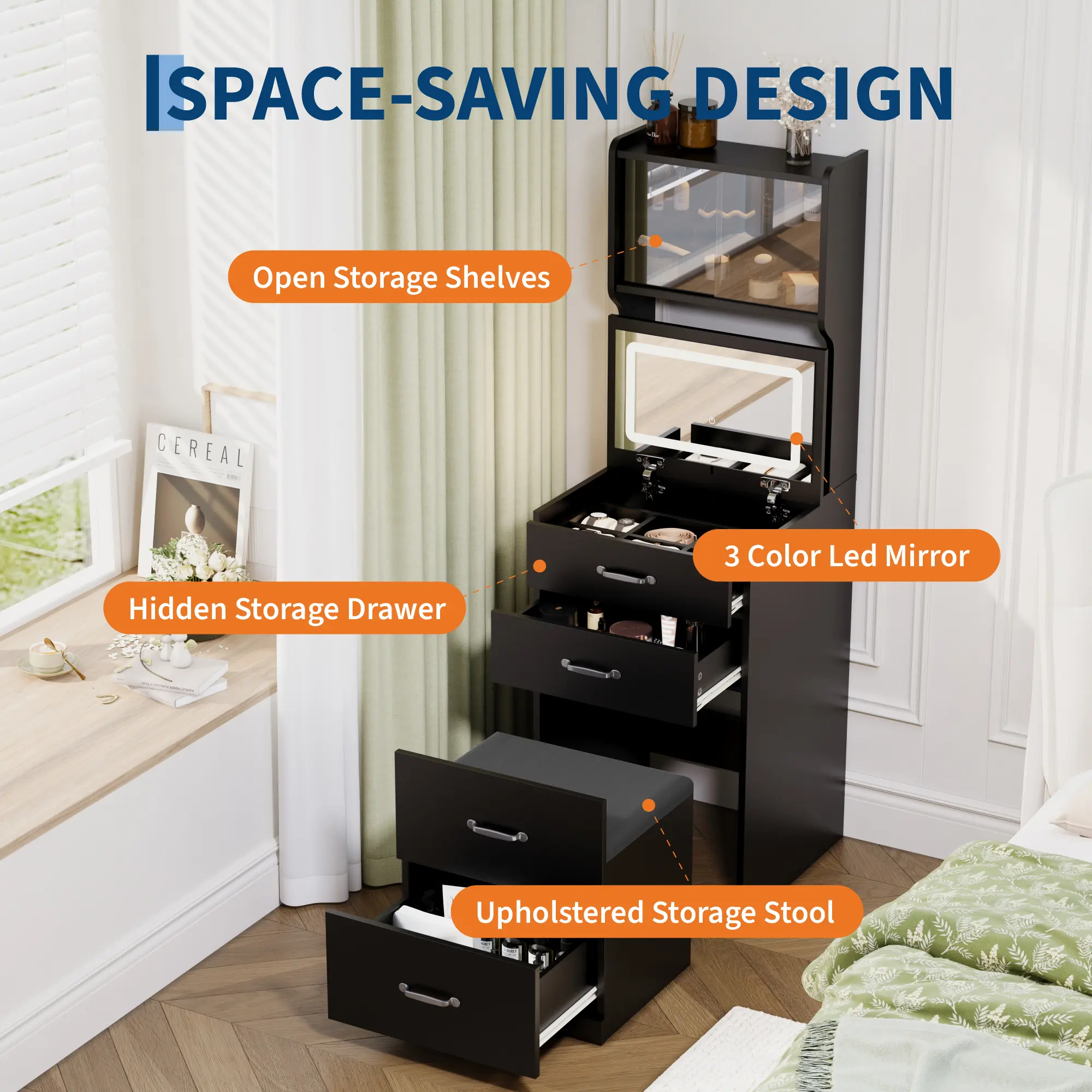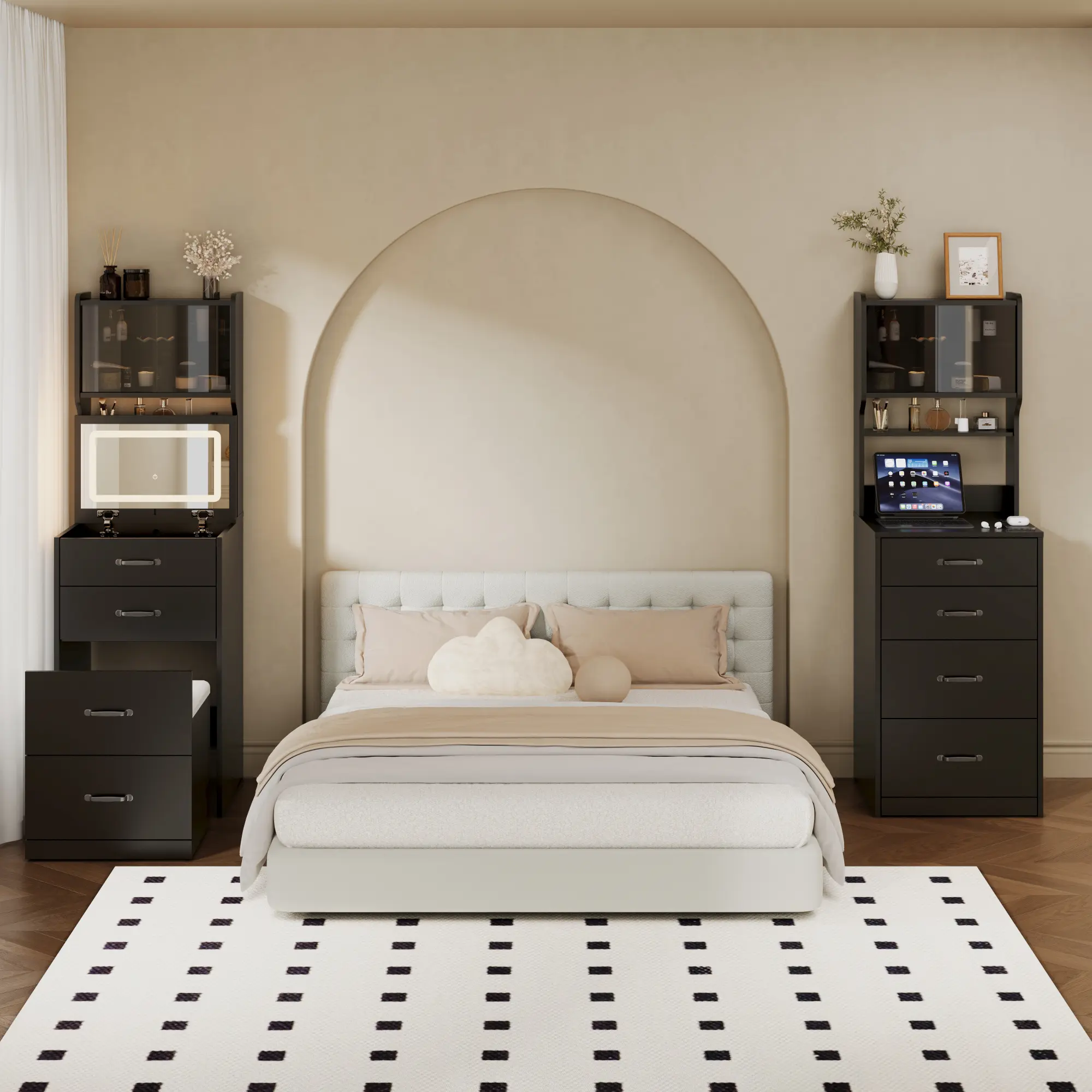 3-in-1 Compact Vanity Set – Makeup Table, bedside table, and Laptop DeskUpgrade your bedroom or small living space with this multifunctional vanity set, expertly designed for modern lifestyles and compact areas. Whether you need a chic makeup dressing table, a practical bedside table, or a convenient laptop desk, this multi-purpose solution adapts effortlessly to your needs.Smart 3-in-1 Design: Easily switch between a makeup vanity, bedside table, and writing or laptop desk. The turn-up mirror with integrated LED lights transforms your surface instantly, while the fold-down design keeps things sleek when not in use—perfect for apartments, dorms, and small bedrooms.Customizable LED Lighting: Achieve perfect makeup lighting with three adjustable LED color modes—white, warm white, and yellow—at your fingertips. The smart touch control lets you fine-tune brightness for flawless application any time of day or night.Integrated Charging Station: Stay connected and ready with built-in power outlets and a USB port. Conveniently power your phone, tablet, or beauty devices like hair dryers and straighteners right at your vanity.Generous Storage Solutions: Keep your basics organized with three spacious drawers, a two-tier cabinet featuring adjustable shelves, and a dedicated jewelry organizer. The matching chair even includes an additional storage drawer, ensuring everything from skincare to accessories is within easy reach.Space-Saving & Stylish: Designed for tight spaces, this slim vanity set fits perfectly beside your bed or tucked in a corner. Its modern aesthetic complements any décor while offering a private, comfortable space for beauty routines, work, or nightly reading.Discover the high-quality blend of function and elegance for your bedroom furniture collection. This 3-in-1 vanity set elevates your daily routine while maximizing every inch of your space.