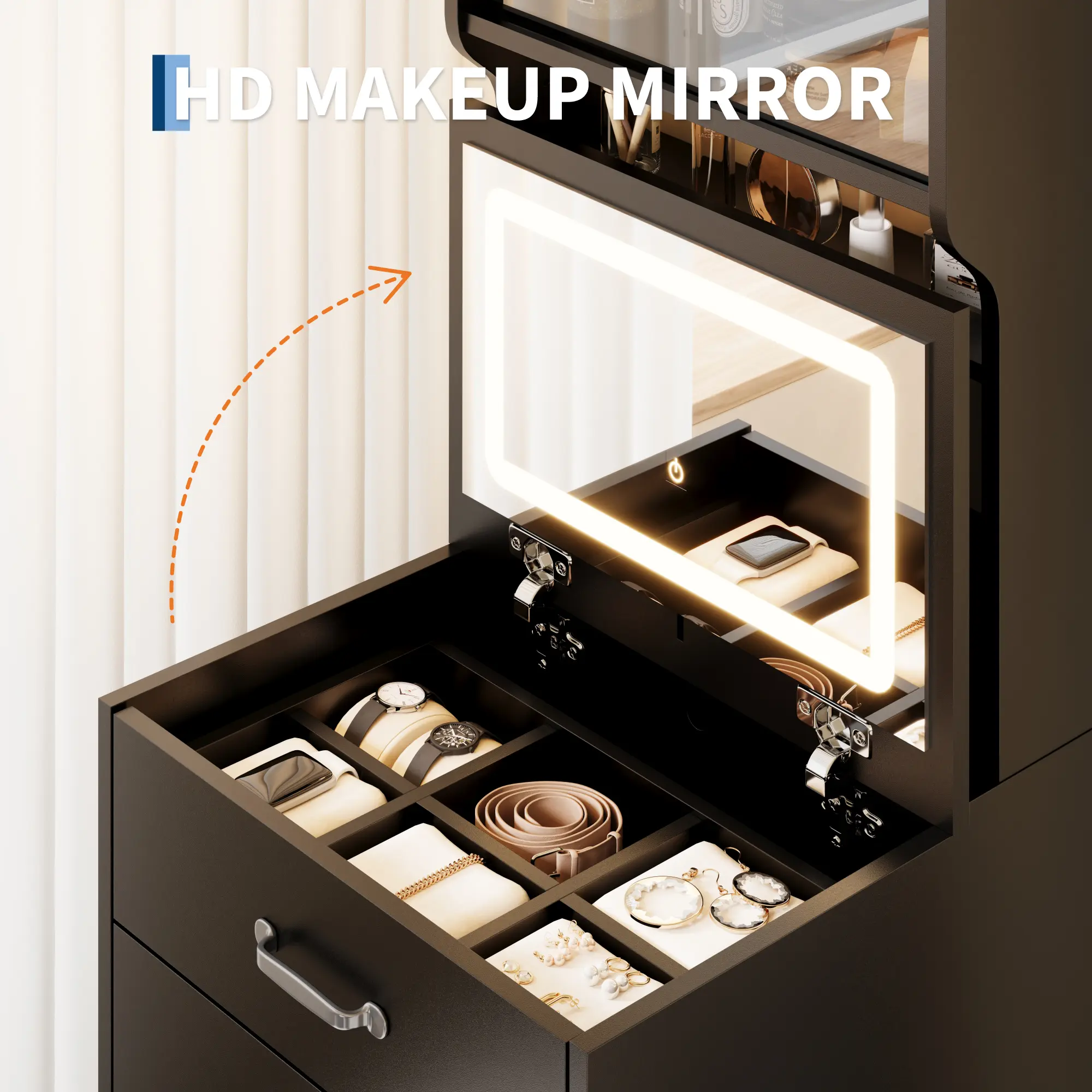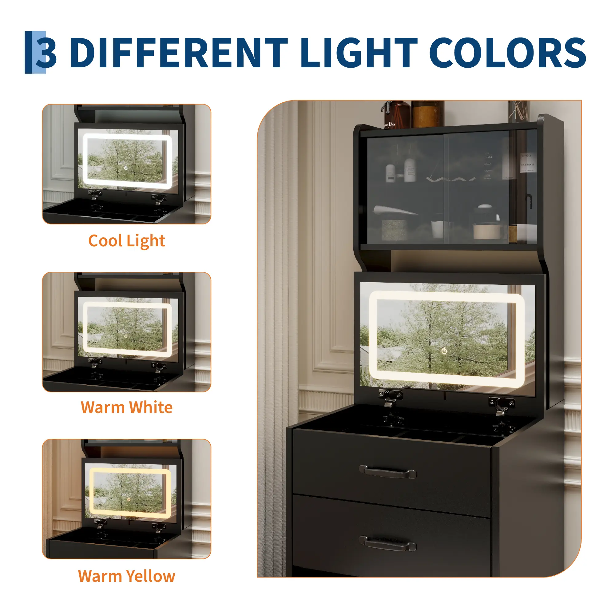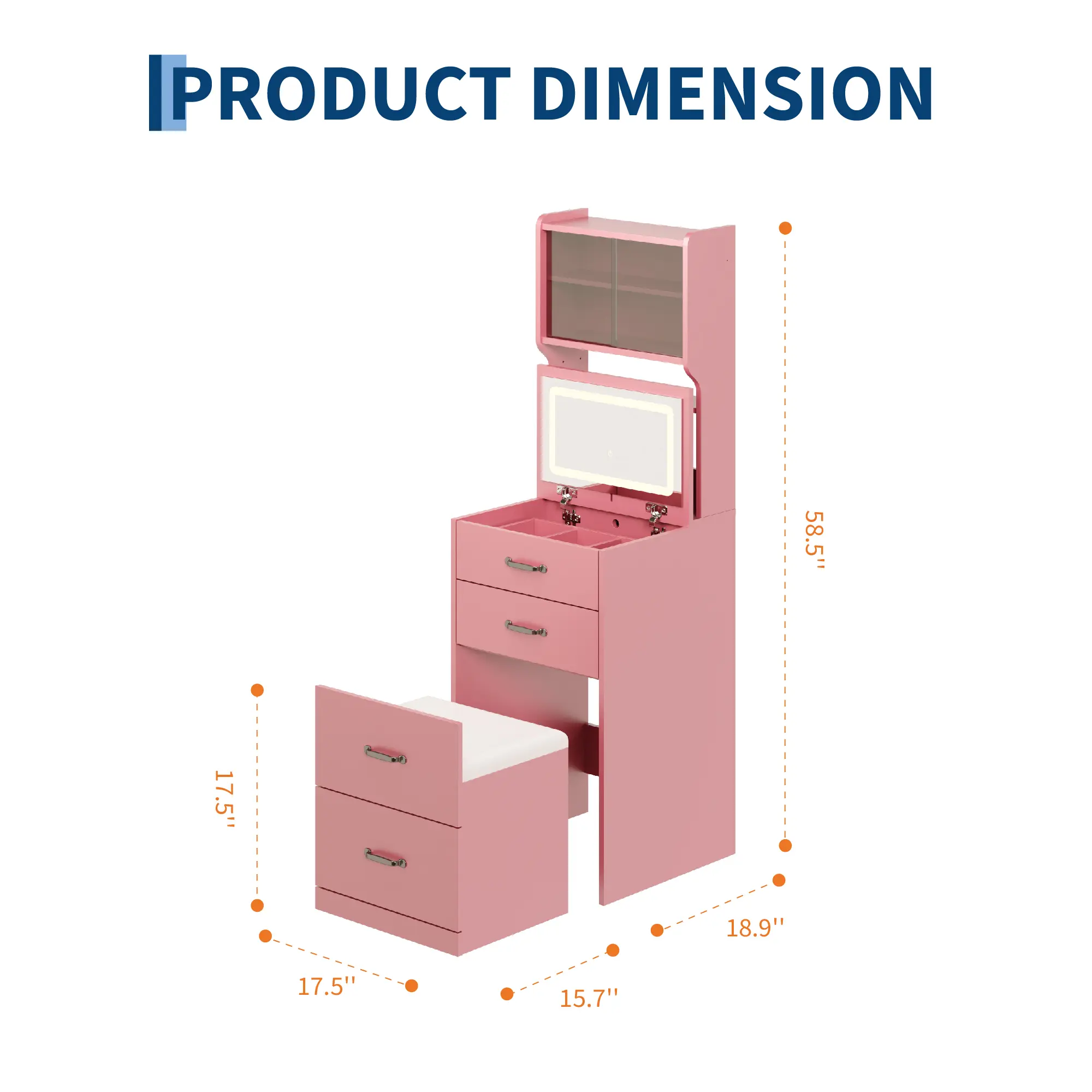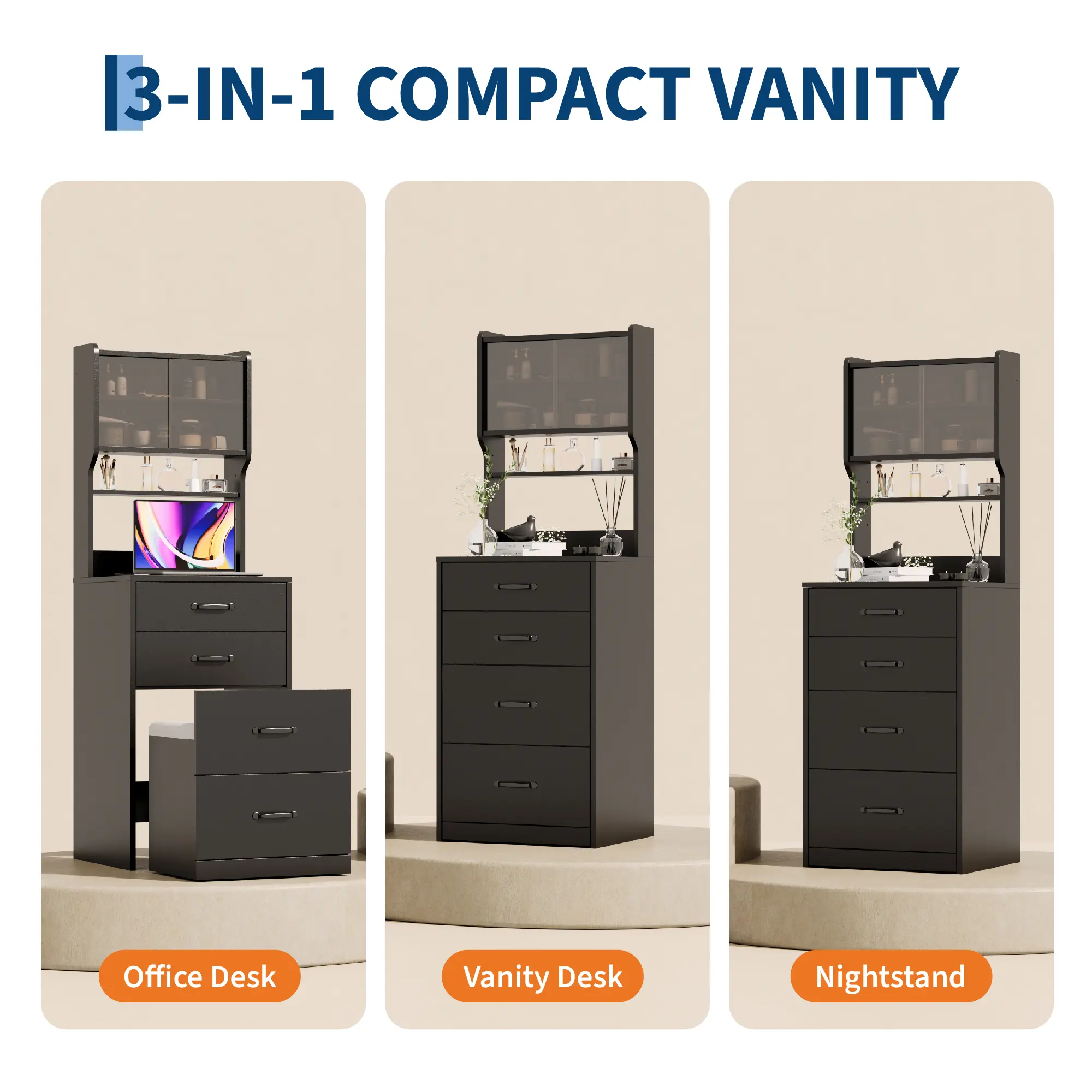 3-in-1 Compact Vanity Set – Makeup Table, bedside table, and Laptop DeskUpgrade your bedroom or small living space with this multifunctional vanity set, expertly designed for modern lifestyles and compact areas. Whether you need a chic makeup dressing table, a practical bedside table, or a convenient laptop desk, this multi-purpose solution adapts effortlessly to your needs.Smart 3-in-1 Design: Easily switch between a makeup vanity, bedside table, and writing or laptop desk. The turn-up mirror with integrated LED lights transforms your surface instantly, while the fold-down design keeps things sleek when not in use—perfect for apartments, dorms, and small bedrooms.Customizable LED Lighting: Achieve perfect makeup lighting with three adjustable LED color modes—white, warm white, and yellow—at your fingertips. The smart touch control lets you fine-tune brightness for flawless application any time of day or night.Integrated Charging Station: Stay connected and ready with built-in power outlets and a USB port. Conveniently power your phone, tablet, or beauty devices like hair dryers and straighteners right at your vanity.Generous Storage Solutions: Keep your basics organized with three spacious drawers, a two-tier cabinet featuring adjustable shelves, and a dedicated jewelry organizer. The matching chair even includes an additional storage drawer, ensuring everything from skincare to accessories is within easy reach.Space-Saving & Stylish: Designed for tight spaces, this slim vanity set fits perfectly beside your bed or tucked in a corner. Its modern aesthetic complements any décor while offering a private, comfortable space for beauty routines, work, or nightly reading.Discover the high-quality blend of function and elegance for your bedroom furniture collection. This 3-in-1 vanity set elevates your daily routine while maximizing every inch of your space.