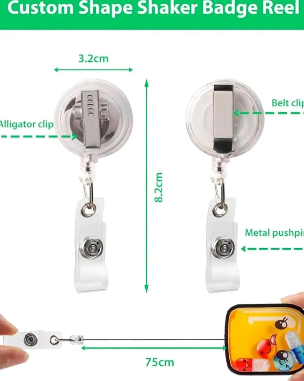 Unique Design: Featuring a distinctive and eye-catching custom shape, this badge reel combines practicality with style. Its compact size makes it easy to attach securely to clothing or accessories, adding a touch of personality.