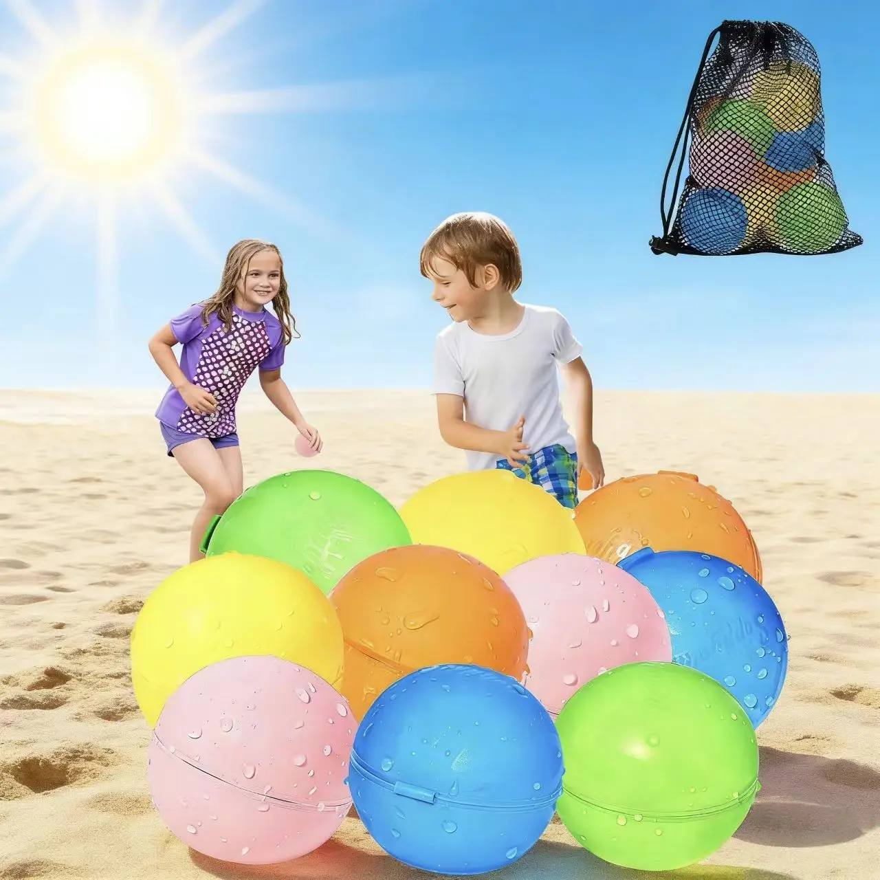 12-Pack Reusable Water Balloons for Endless Kid’s Fun – No Tying, No Hassle! Simply submerge the balloons in water, and they’ll instantly fill up and self-seal—no tricky knot-tying required! Spend less time prepping and more time joining the water fight fun.