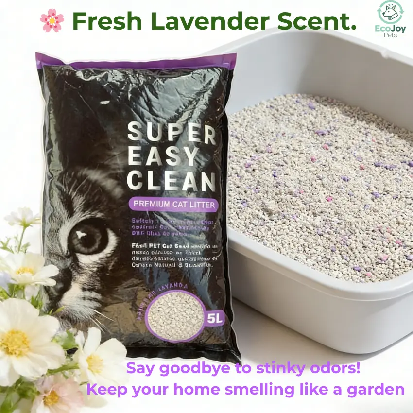 5L of pure bentonite power ensures long-lasting freshness, saving you time and money. Solid clumps mean you only remove the waste, keeping the rest of the litter clean. Material: 100% Natural Premium Bentonite Clay. Scent: Fresh Lavender. Volume: 5L. Suitable for all cat breeds and standard litter boxes.