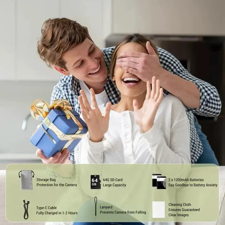 Perfect Gift: This photo camera comes with 64GB SD card, lanyard, storage bag, two batteries, Type-C cable, cleaning cloth & elegant gift box. It’s a wonderful surprise for birthdays, Christmas or special moments—ideal first real camera for kids, teens, students, adults who love shooting!