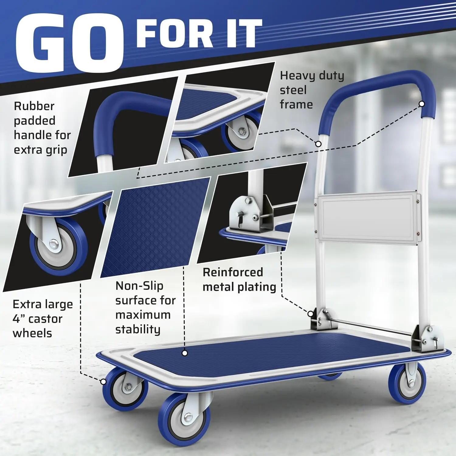 Heavy Duty Foldable Push Cart Dolly | 330 lbs. Capacity | Upgraded Collapsible Hand Truck Folding Platform with Swivel Wheels | Flat Bed Moving Wagon | Space Saving Push Handle (Blue)