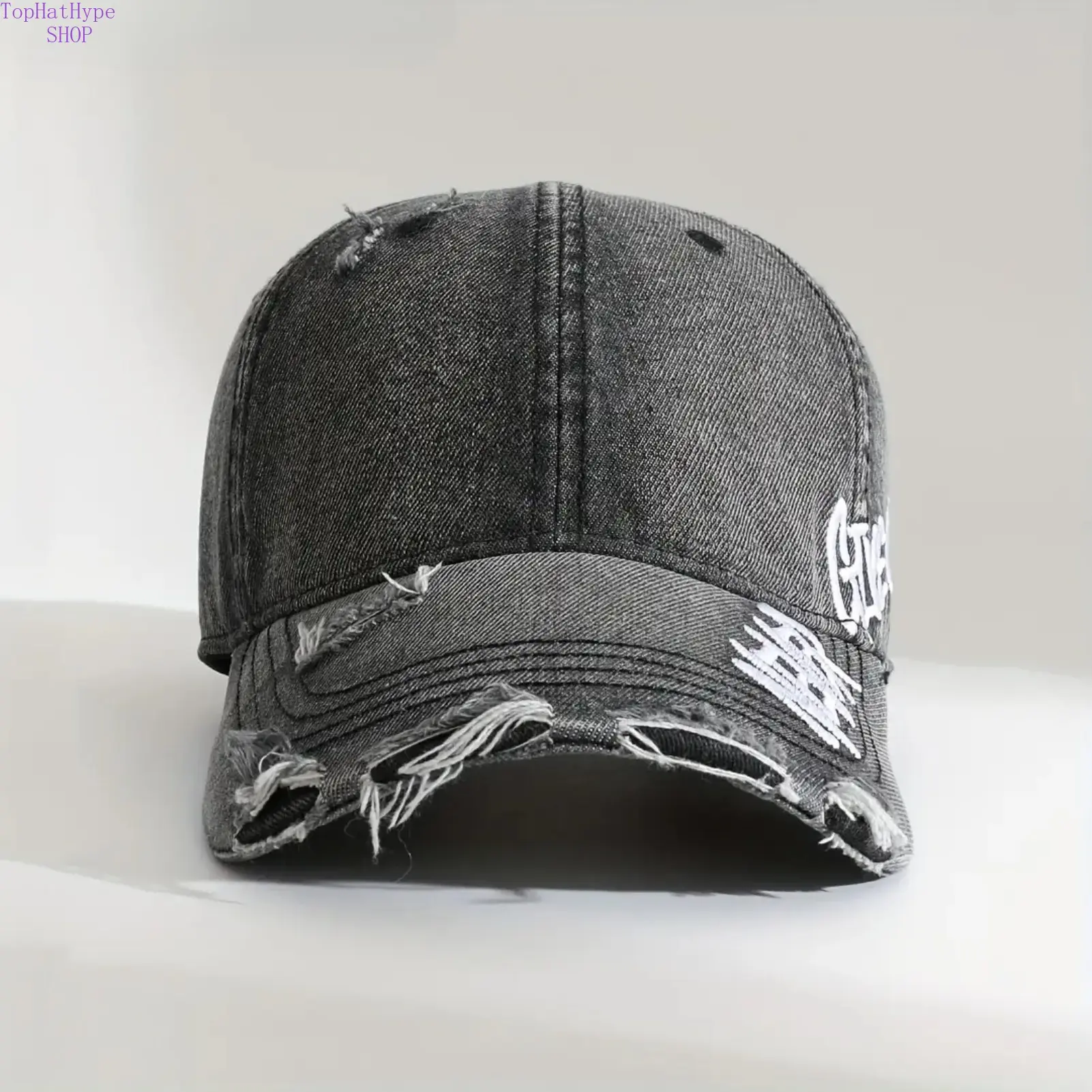 Two-pack of women's hats, stylish retro washed and distressed blue baseball caps, with vintage lettering embroidery on the sides, frayed brim, simple wide brim that shows off the face, windproof hiking hats, unisex and versatile style, adjustable size.