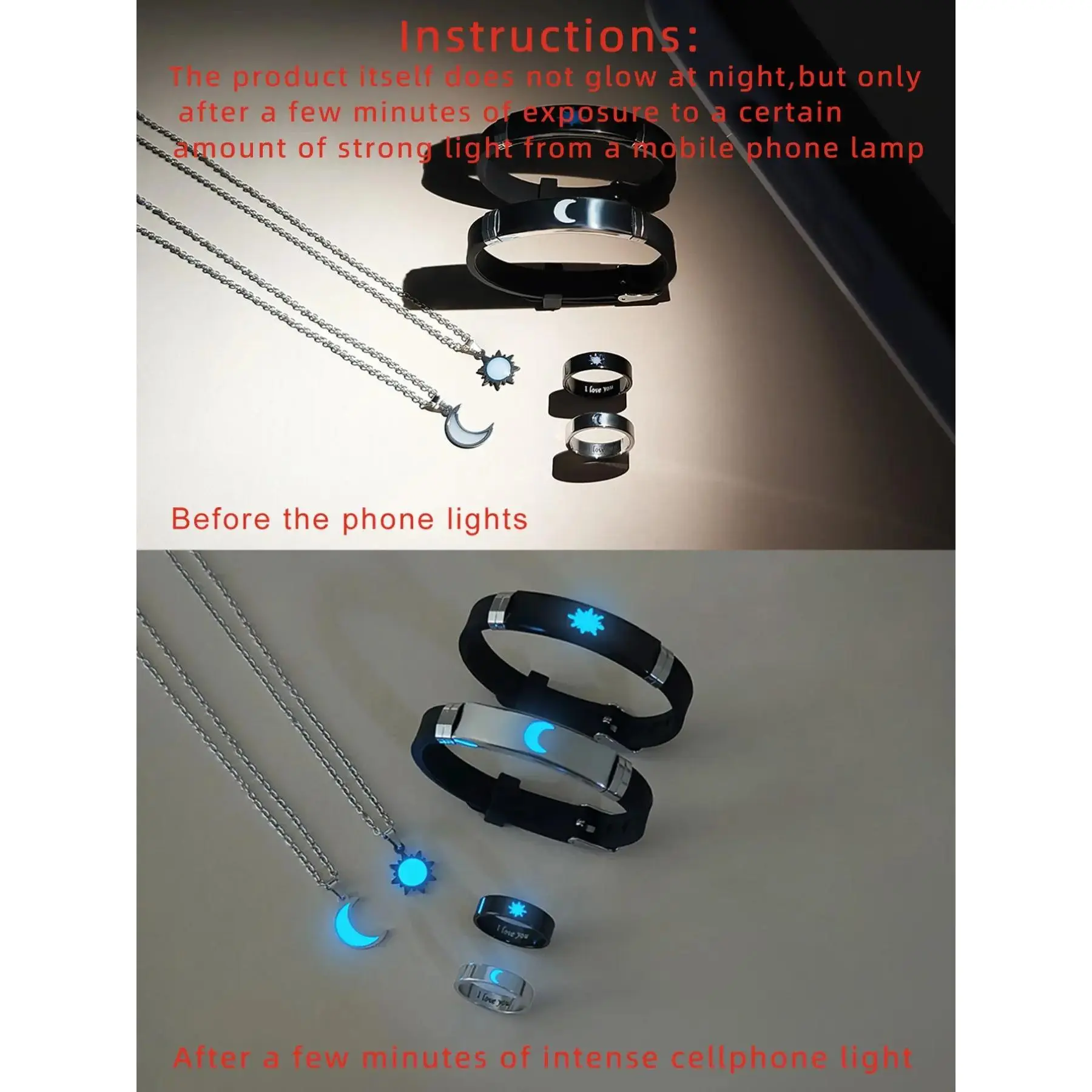 6 pieces/set of luminous day and night couple necklace, bracelet and ring set - simple and cute style - shining and glowing - ideal for Valentine's Day declaration and gift