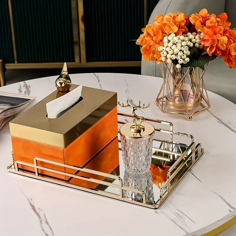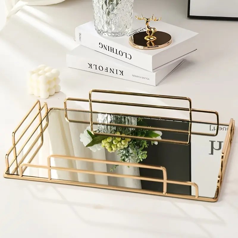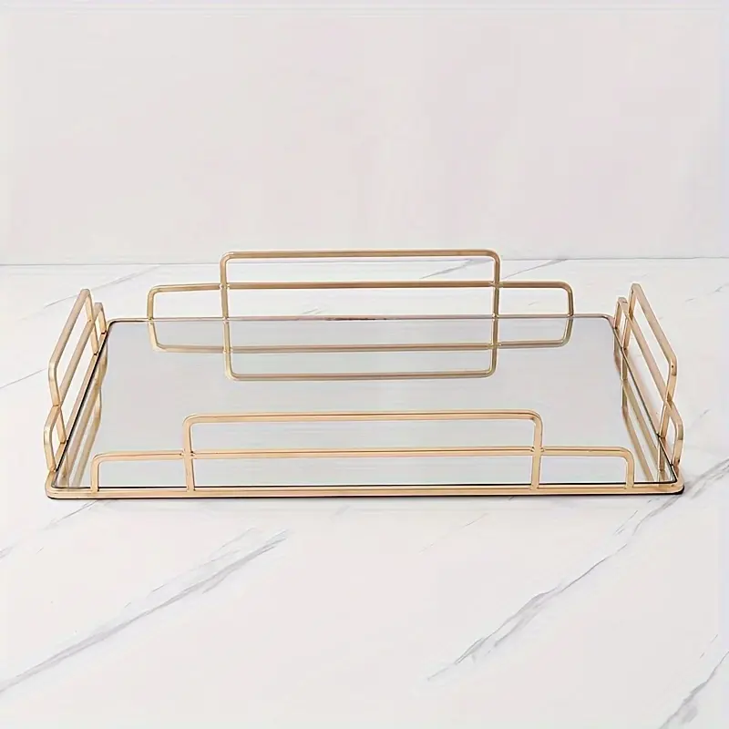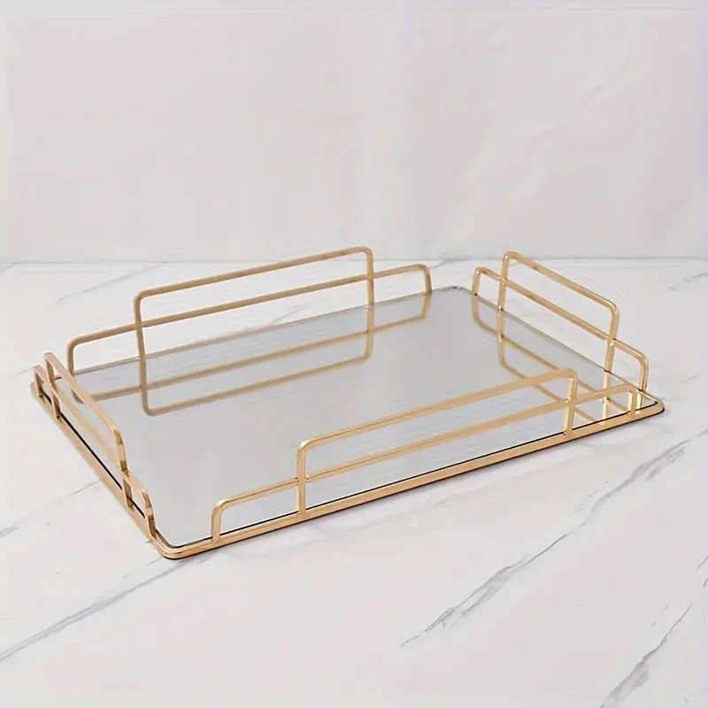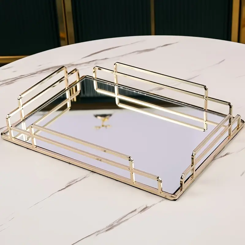 Light luxury ornament iron wire tray, household storage tray, tea table, living room desktop rectangular decoration tea tray black tray, glass plate metal tray decoration