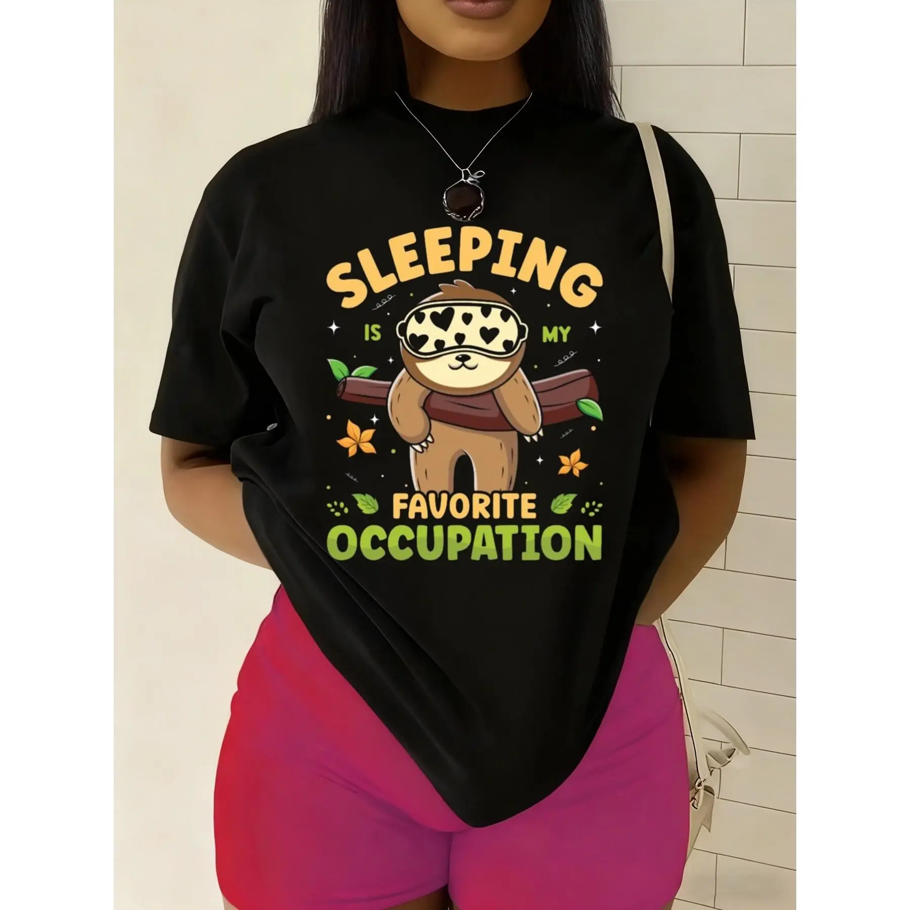 Women'S Sleepy Sloth Graphic T-Shirt - Funny "Sleeping Is My Favorite Occupation" Slogan & Sloth Design, Black Relaxed Fit Casual Streetwear, Soft Everyday Comfort Short Sleeve Round Neck Tee For Women (Sizes XXX1-3XL) - All-Season Wearable From Loc