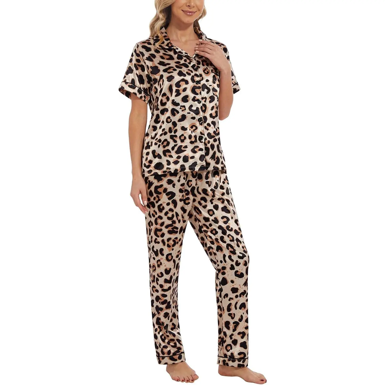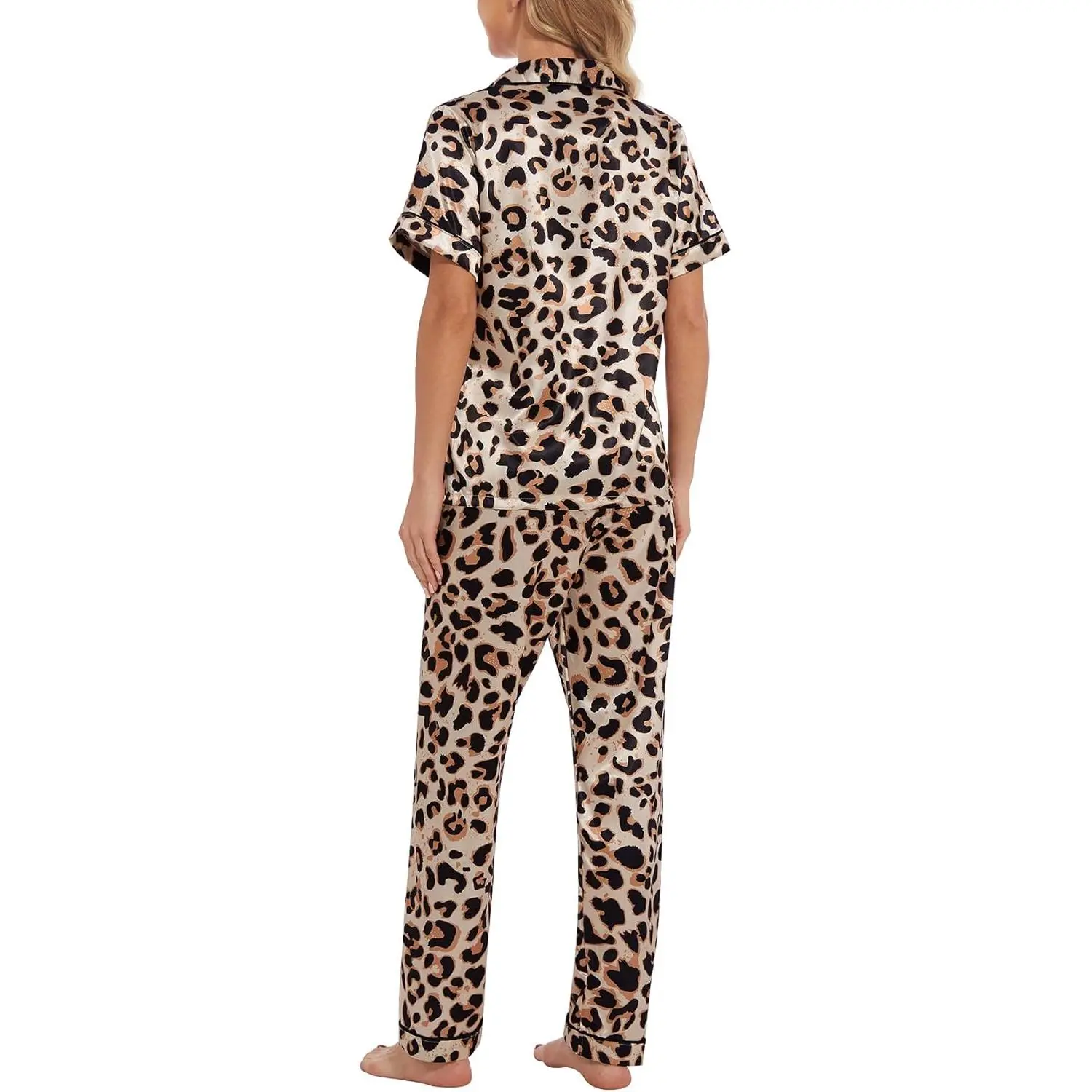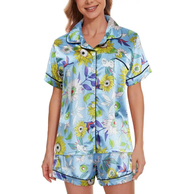 5. Womens Silk Satin Pajamas Set Short Sleeve Sleepwear Soft Button Down Loungewear Two-piece Pjs Sets XS-XXL