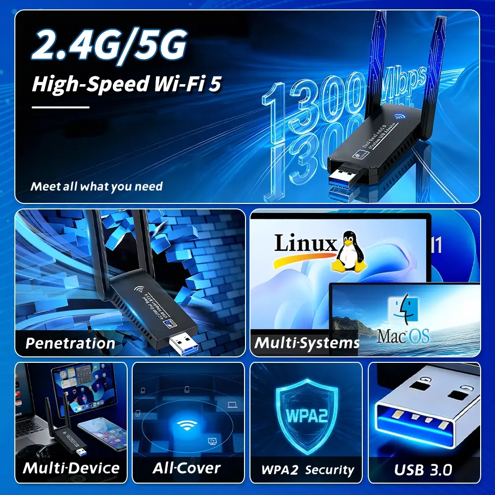 USB 3.0 Wireless Network Adapter, Plug-And-Play, Ac1300 WiFi 5 Dual Band, 2.4GHz & 5GHz, Wpa2 Encryption, Compatible with Windows/linux/macosUSB 3.0 Wireless Network Adapter, Plug-And-Play, Ac1300 WiFi 5 Dual Band, 2.4GHz & 5GHz, Wpa2 Encryption, Compatible with Windows/linux/macosUSB 3.0 Wireless Network Adapter, Plug-And-Play, Ac1300 WiFi 5 Dual Band, 2.4GHz & 5GHz, Wpa2 Encryption, Compatible with Windows/linux/macosUSB 3.0 Wireless Network Adapter, Plug-And-Play, Ac1300 WiFi 5 Dual Band, 2.4GHz & 5GHz, Wpa2 Encryption, Compatible with Windows/linux/macosUSB 3.0 Wireless Network Adapter, Plug-And-Play, Ac1300 WiFi 5 Dual Band, 2.4GHz & 5GHz, Wpa2 Encryption, Compatible with Windows/linux/macos