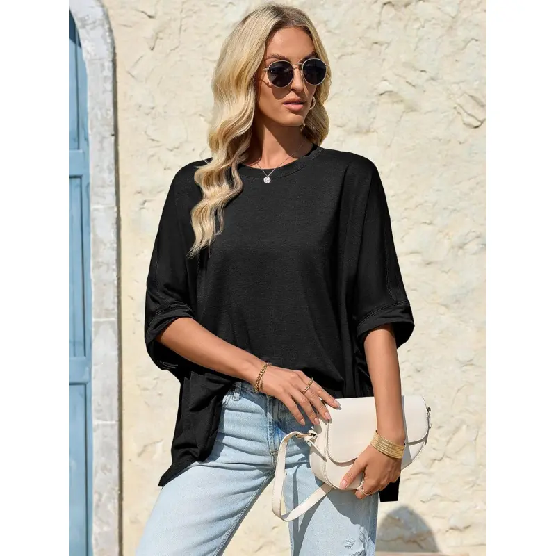 Material: This womens oversied tshirts is made of 61% polyester, 33% cotton, 6% elastane, which is soft, skin-friendly, breathable, light, flowing, keeping you comfortable and relaxed when wearing this casual tops Feature: Designed with a loose fit style, oversized, solid color, batwing sleeve, crew neck, drop shoulders. With its unique inverted curved hem design and playful side slits, it's the perfect mix of comfort and style. Suitable for any body type Occasion: These batwing sleeve tops are stylish yet functional, making them a must-have for your summer wardrobe. Ideal choice for various occasions, including daily wear, casual outings, sport, school, office, gym workouts, and even as maternity tops All Match: Whether you're going for a workout or a casual day out, this comfy soft t shirt is a must-have. Pair with leggings, jeans, lounge short or denim shorts for a fashion and casual outfit. Great for spring, summer and fall Easy to Care for:Recommend wash in cold water. Do not bleach/Wash with similar colours/Dryclean/Gentle cycle/Low iron. Please refer to the size chart on detailed picture before purchasing
