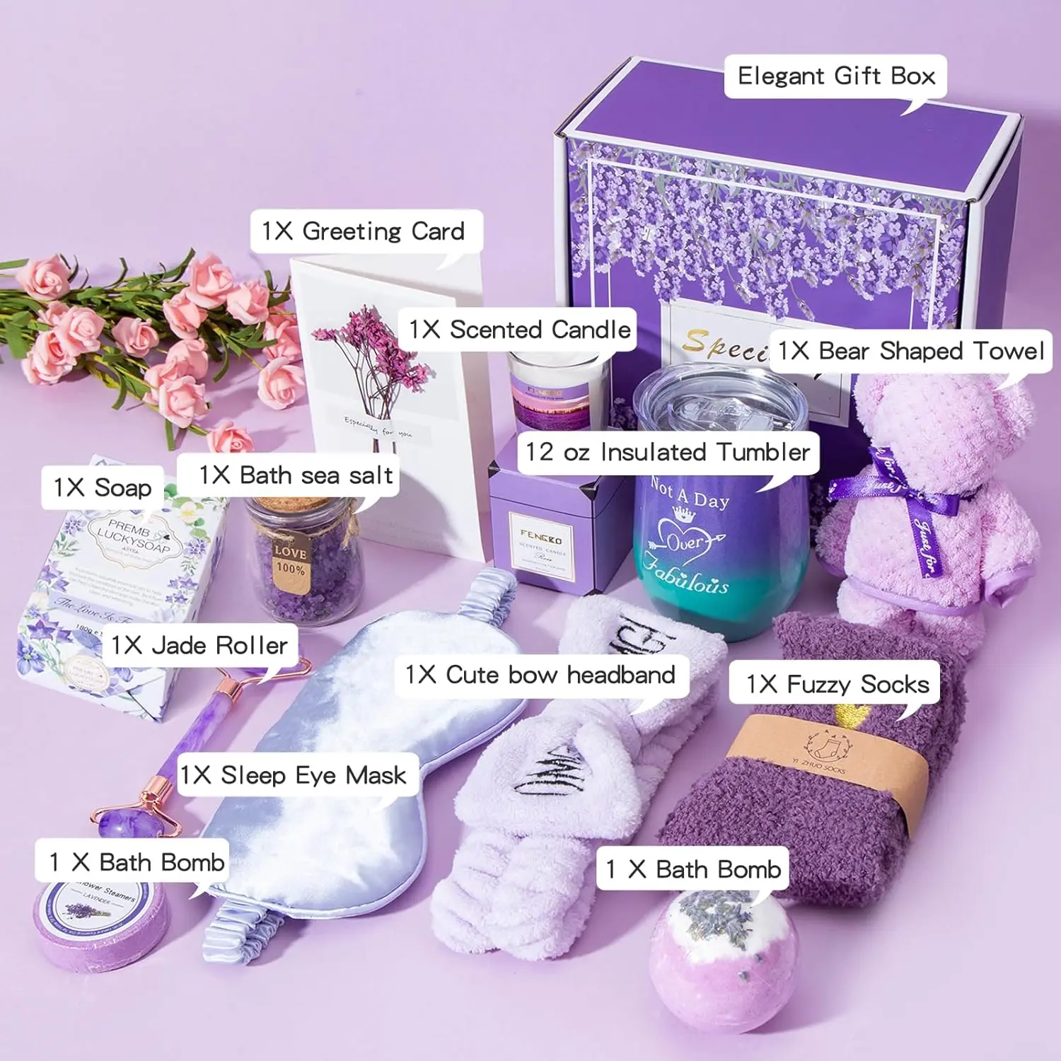 ·【An Unforgettable Unboxing 】: The unique gift basket contains 1X 12 oz Insulated Stainless Steel ,2X Bath Bomb, 1X Sleep Eye Mask,1X Soap,1X Scented Candle,1X Fuzzy Socks,1X Greeting Card,1X Bear Shaped Towel,1X Cute bow headband,1X Jade Roller, 1X Bath sea salt