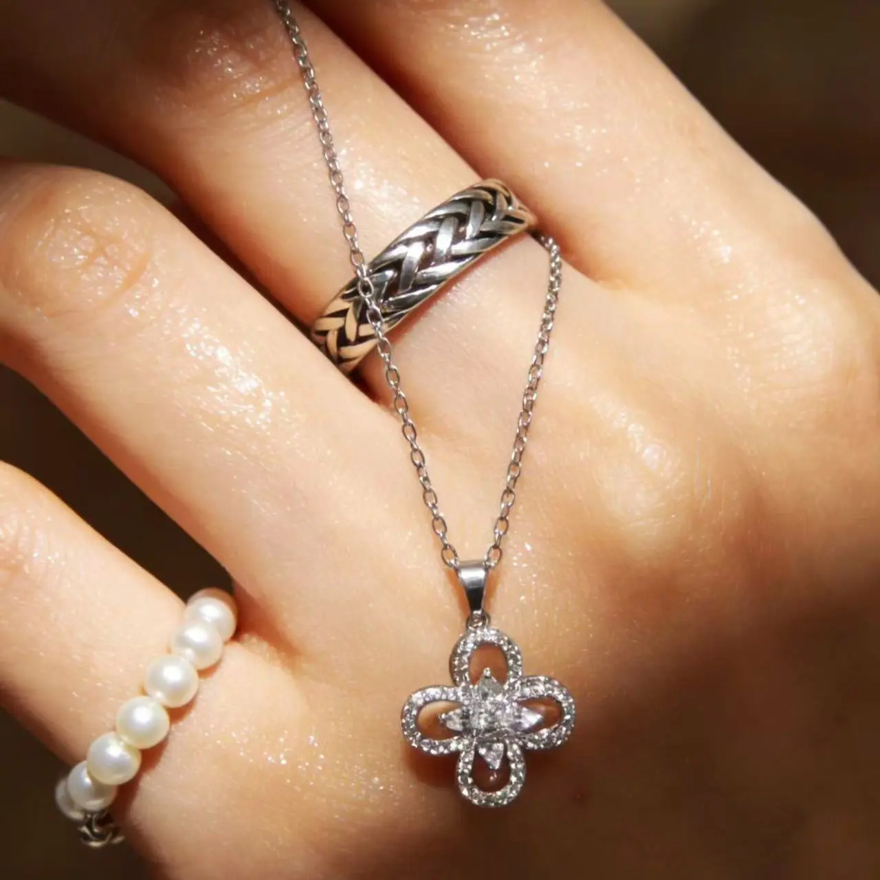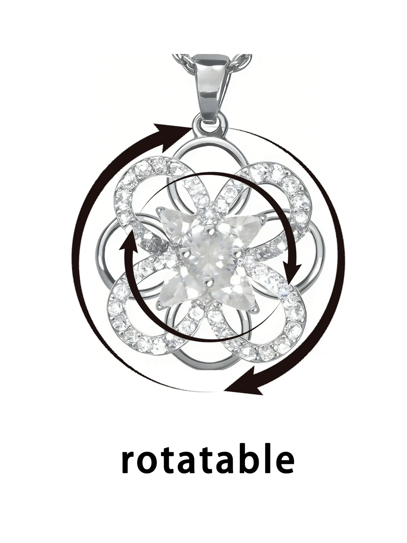 Design: Elegant flower-shaped pendant with a smooth rotatable/spinning center — spin the flower for a satisfying fidget experience, fully paved with brilliant round cubic zirconia stones for a dazzling, eye-catching sparkle