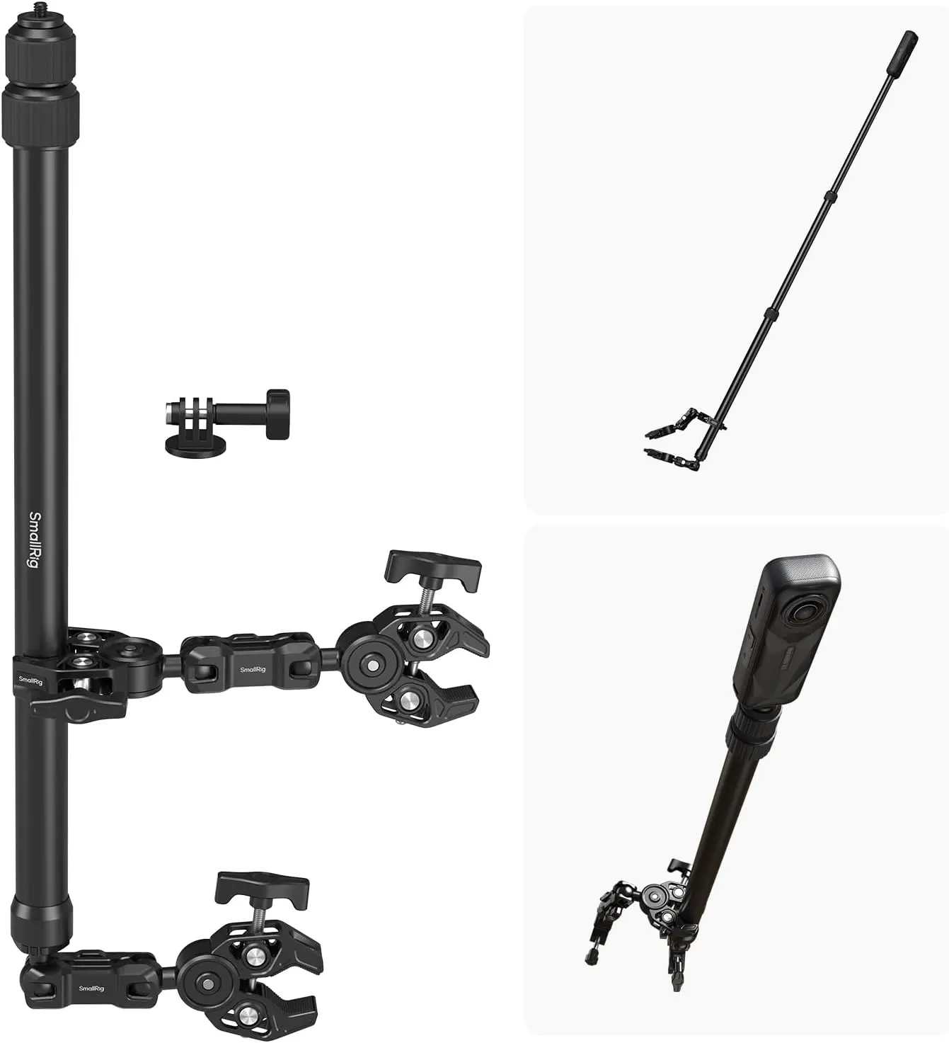 ·All-in-One Bundle: This comprehensive kit includes 360° dual head super clamp x 1, crab-shaped clamp x 1, camera extension arm x 1 (extends to 120cm / 47.2" and collapses to 45cm / 17.7"), and universal action camera 2-prong adapter x 1.