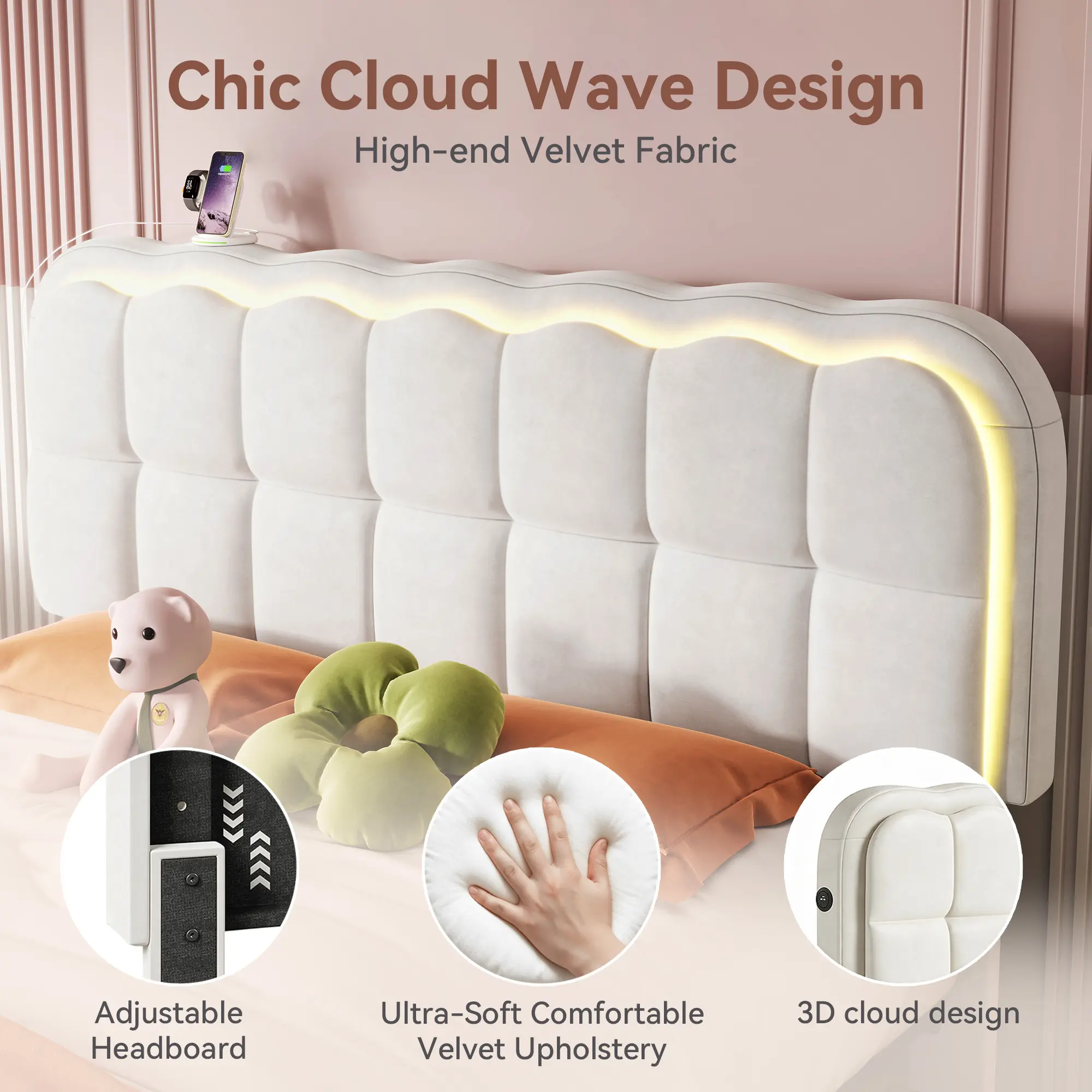 Modernize your bedroom with this queen bed frame featuring LED lights. The velvet upholstered headboard offers gentle, comfortable support, ensuring you wake up refreshed. No box spring needed, making it a hassle-free addition to your room. The beige color complements any decor, enhancing the bedroom's atmosphere.