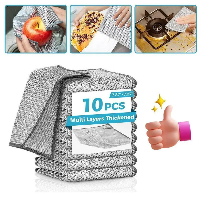 Powerful Cleaning Without Scratching Crafted with single layer high-quality non-scratch wire material, these cloths effectively remove stubborn dirt and grime without damaging your pots, pans, sinks, or kitchen surfaces. Durable & Long-Lasting Built to withstand repeated use, these cloths offer strong cleaning performance for everyday kitchen messes-wet or dry. Reusable & Washable single layerMachine-washable and hand-washable, they're an eco-friendly and cost-effective alternative to disposable sponges or paper towels. Multipurpose Cleaning Perfect for kitchens, cookware, countertops, sinks, and more-ideal for home, restaurant, or commercial kitchen use. Pack Includes: ??20 pieces single layer of multipurpose wire cleaning cloths ??Silver-colored, non-scratch wire weave for easy scrubbing and long-lasting use