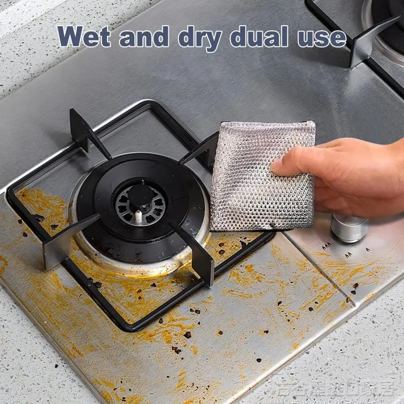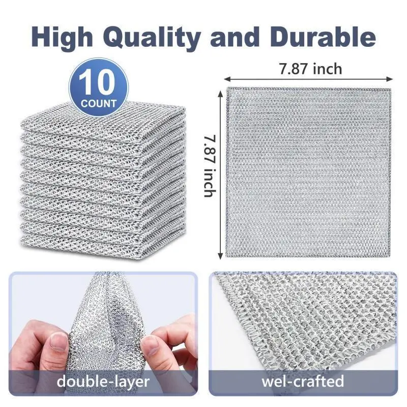 Efficient Cleaning - The metal dish cloth is made of lightweight, gentle, environmentally friendly material, easy to use, easy to clean and easy to carry, good helper for home cleaning No Scratches: Our multipurpose wire miracle cleaning cloths won't scratch pans, dished and pots.Very easy to rinse and dry quickly after washing, no odors leaving behind Material Upgrading - The Non scratch wire dishcloth are made from premium quality materials, with precision stitching and double layers advanced chemical fiber rag.It provides a great cleaning power and won't hurt the pot or your hand Washable and Reusable - This Non scratch wire dishcloth can be hand and machine washed hundreds of times, and still keep effectively clean utensils, replace the use of paper towels which will make a positive effect on the environment Widely Use - These wire cleaning cloths are very suitable for multi household cleaning tasks, such as kitchen, bathroom, garage and so on.The cleaning clothes will effectively clean ceramic pots and pans, sinks, bathtubs, oven trays, stoves, tires, potatoes, eggs, and fruits Note: You will get 10 counts wire cleaning cloth, each metallic fiber cloth measures 7.87 x 7.87 inches. If you have any questions about the dish rags , please contact us on Amazon. We will reply and give you a satisfactory solution