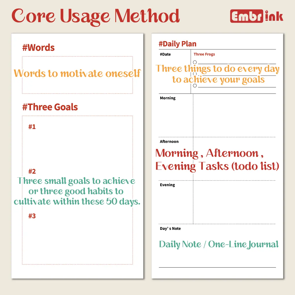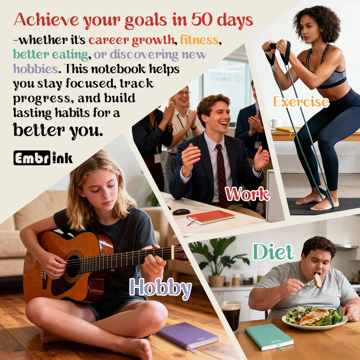 More than a notebook, this journal supports different parts of daily growth. Whether you want to build better habits, stay on top of work, improve routines, capture new ideas, or record small wins, the 50-day format gives your plans a clear structure.