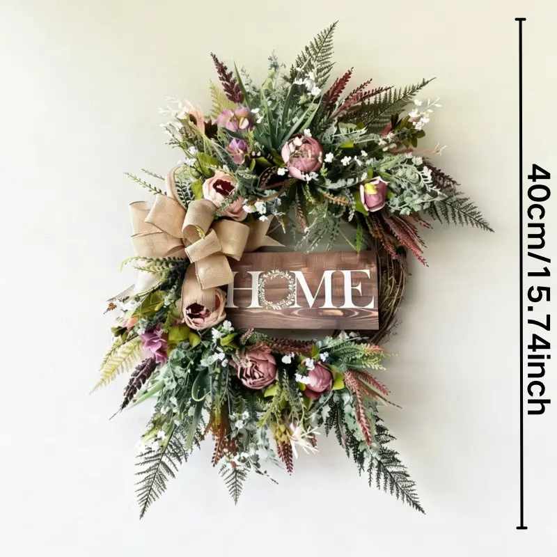 Neutral Color Farmhouse Style Wreath with Peony Flowers, Home Signboard, Hemp Cloth Bow, All-Season Decor for Porch, Living Room, Entryway