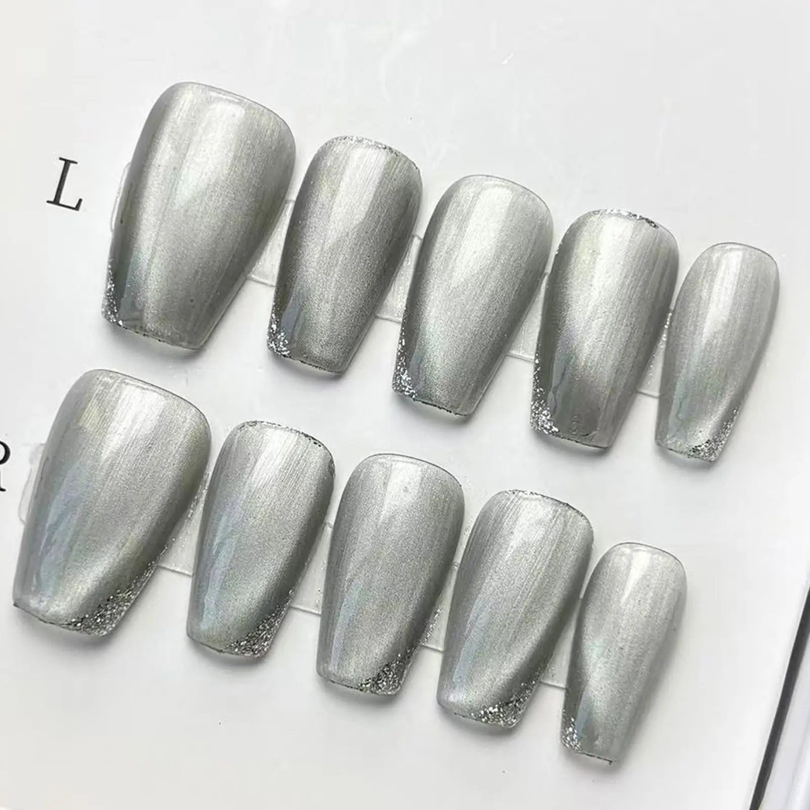 Luxury Nail Freedom! Silver Cat Eye Glitter Edge Press Ons, Get Baddie Nails In 5 Mins, No Salon Needed