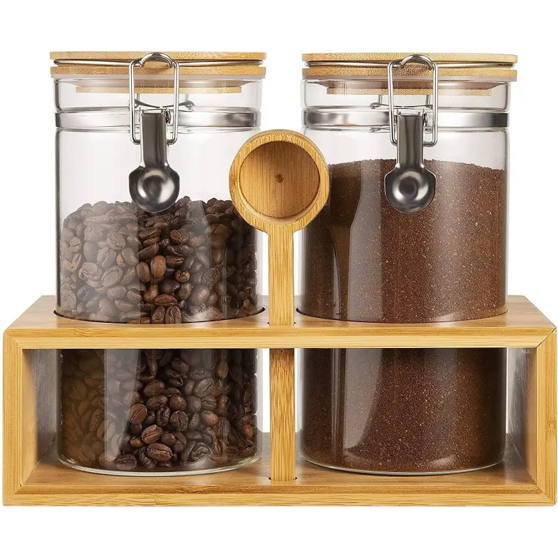 Glass Sugar Coffee Canister for Ground Coffee,2*55OZ Coffee Containers with Handle Shelf Coffee Bar Station Accessories Organizer Decor,Food Storage Jars with Iron Scoop for Kitchen