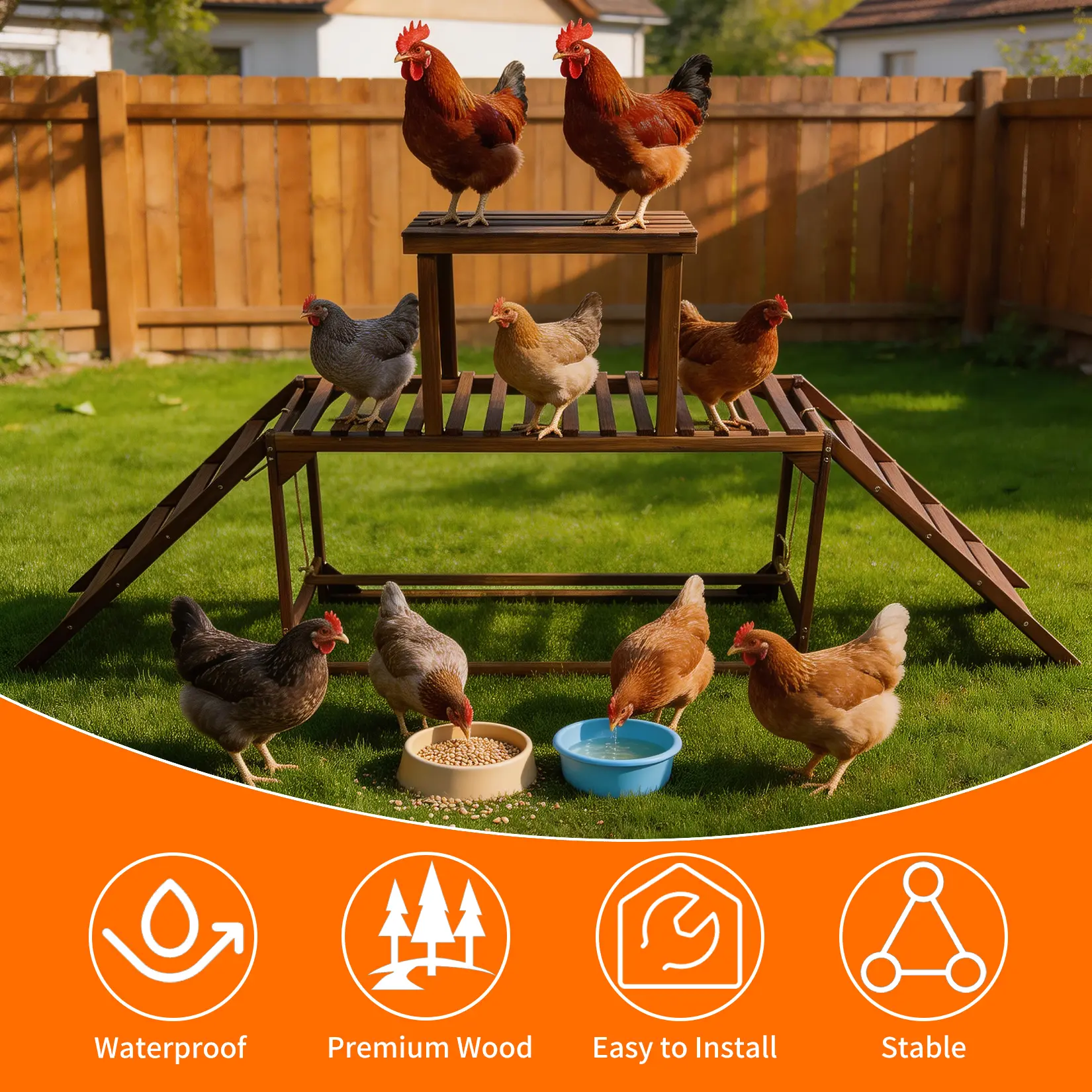 Hygienic Slatted Platform, Quick To Clean : The slatted design lets droppings fall through instead of building up under their feet, keeping the wooden chicken perches drier and more comfortable. Open gaps improve airflow around the flock and make it simple to sweep or rinse for a fresher coop environment.