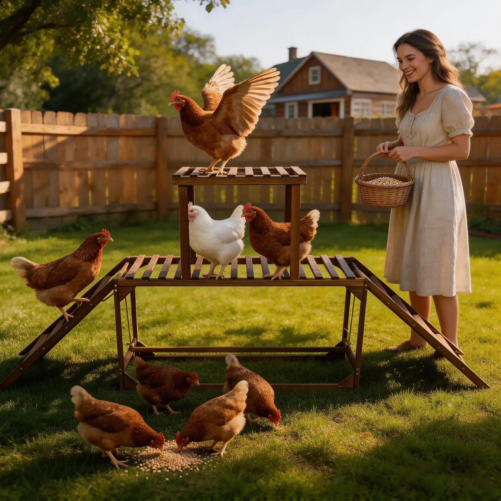 Easy-Climb Ladders & Full-Body Exercise : Two side ramps with 4 wide steps guide birds up and down without risky high jumps, helping reduce leg and wing injuries. The playful layout works like a chicken jungle gym, encouraging daily climbing and movement for stronger, more active chickens.