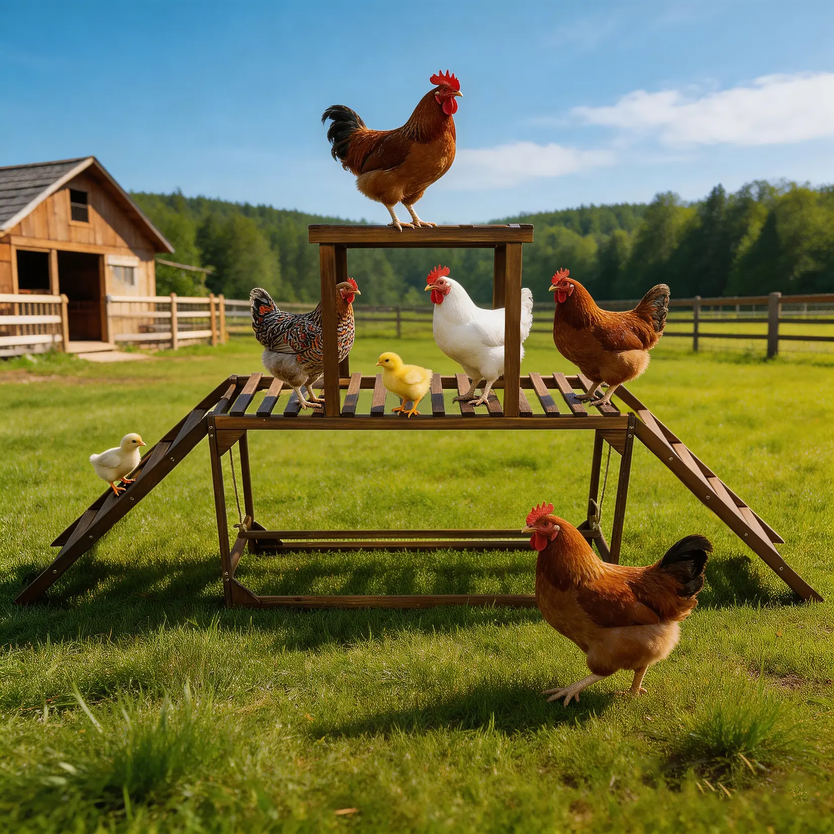 Stable Frame With Adjustable Swing Toy : Reinforced supports keep the structure steady and evenly loaded while your flock climbs, perches and plays. The included chicken perches with swing hang from adjustable ropes so you can set the right height for different ages and breeds, adding enriching motion play that helps relieve boredom pecking.