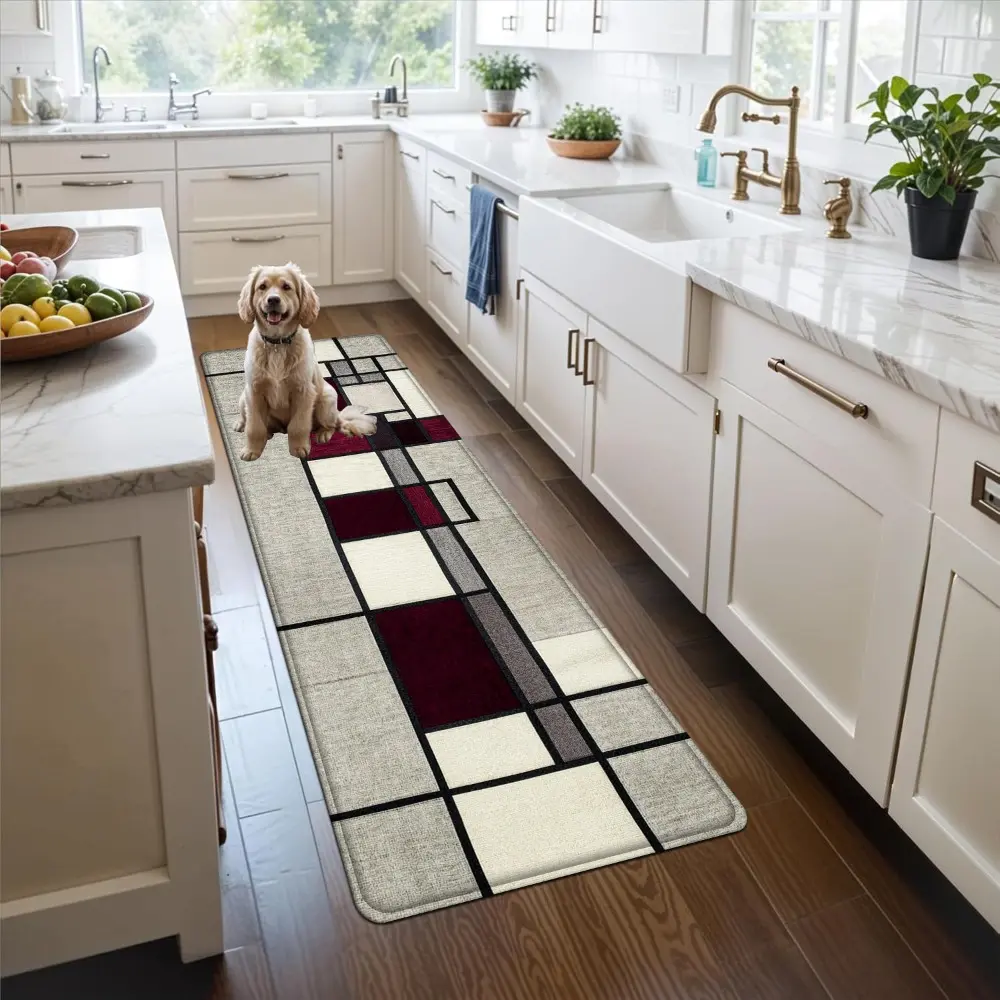1PC, Black Red Gray Geometric Splicing Patterned strip rugs, home décor, bathroom mats, entryway mats, bathroom non-slip mats, indoor entrance rugs, bedroom bedside mats, kitchen mats, hallway rugs, flannel sponge rugs, hallway runner rugs