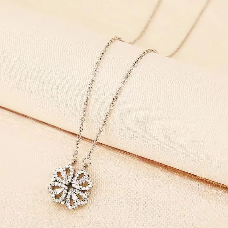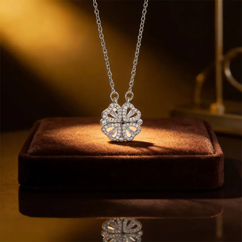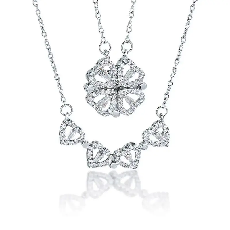 Closed: A delicate four-leaf clover pendant, fully paved with sparkling cubic zirconia Opened: A romantic heart-shaped necklace, with 4 heart-shaped CZ pendantsThe magnetic closure ensures smooth folding and secure wear, no slipping or falling out