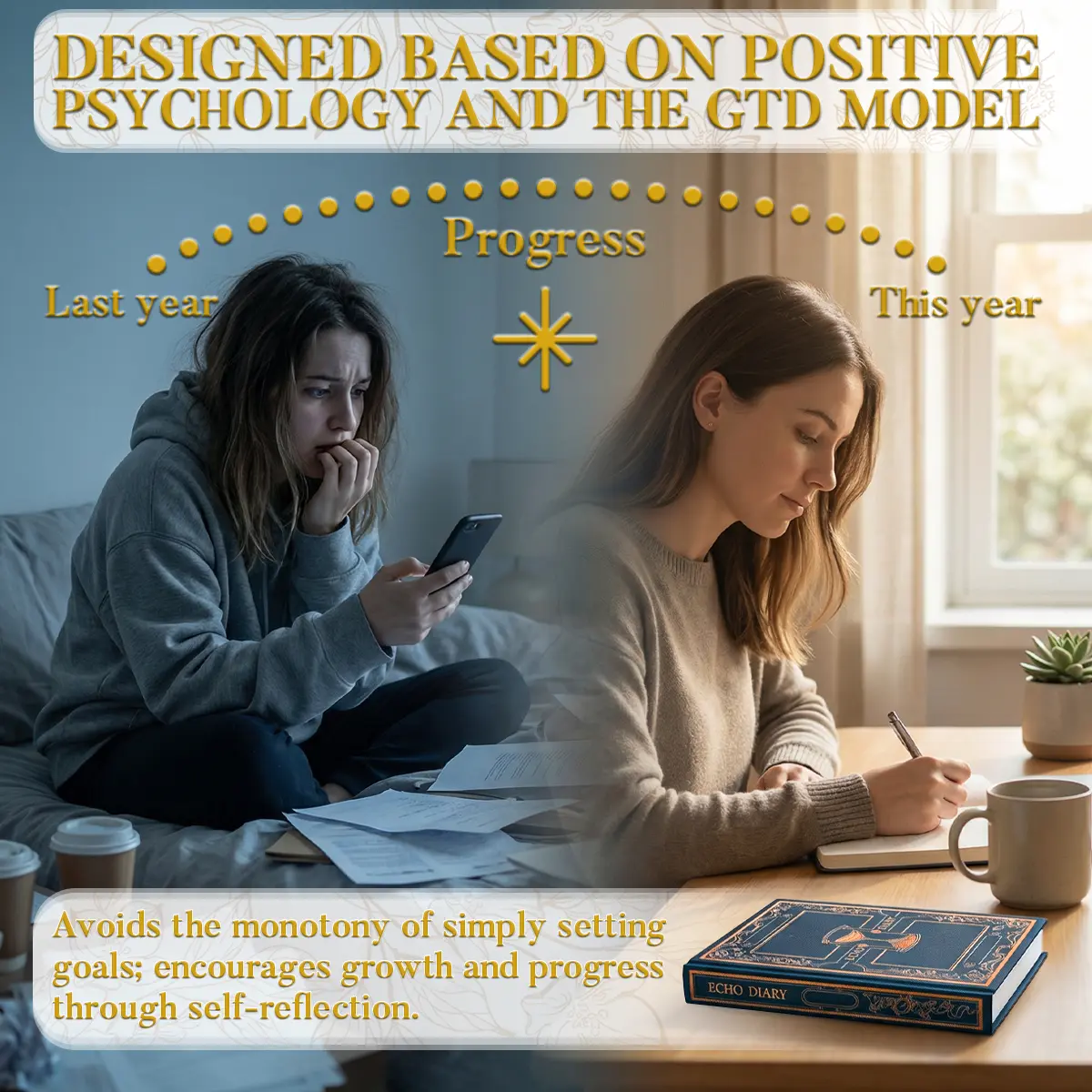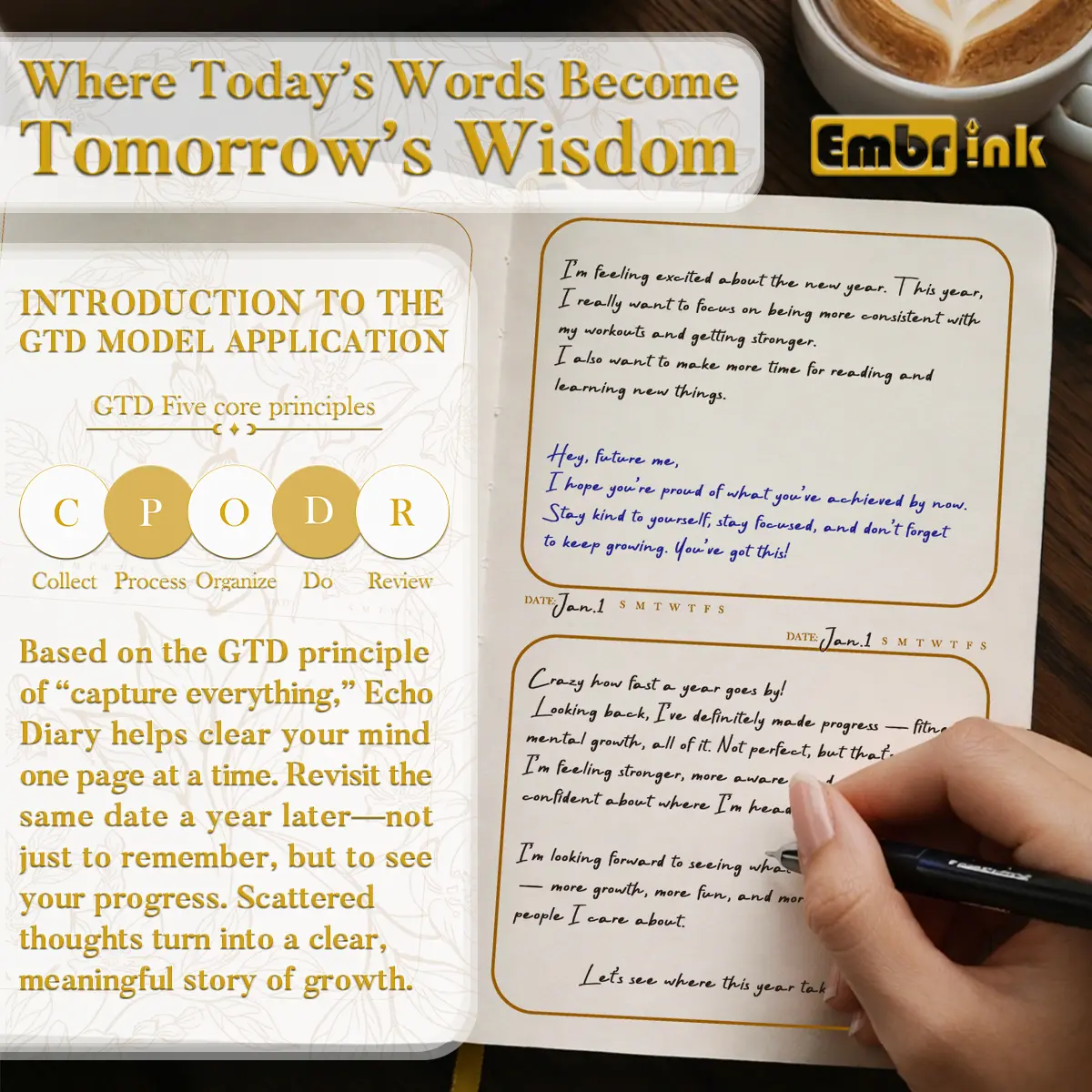 Turn daily thoughts into lasting memories with Echo Diary, a guided reflection journal designed for goal setting, self review, and everyday writing. Inspired by the GTD method, it helps you capture ideas, organize priorities, and build a clearer daily writing habit.