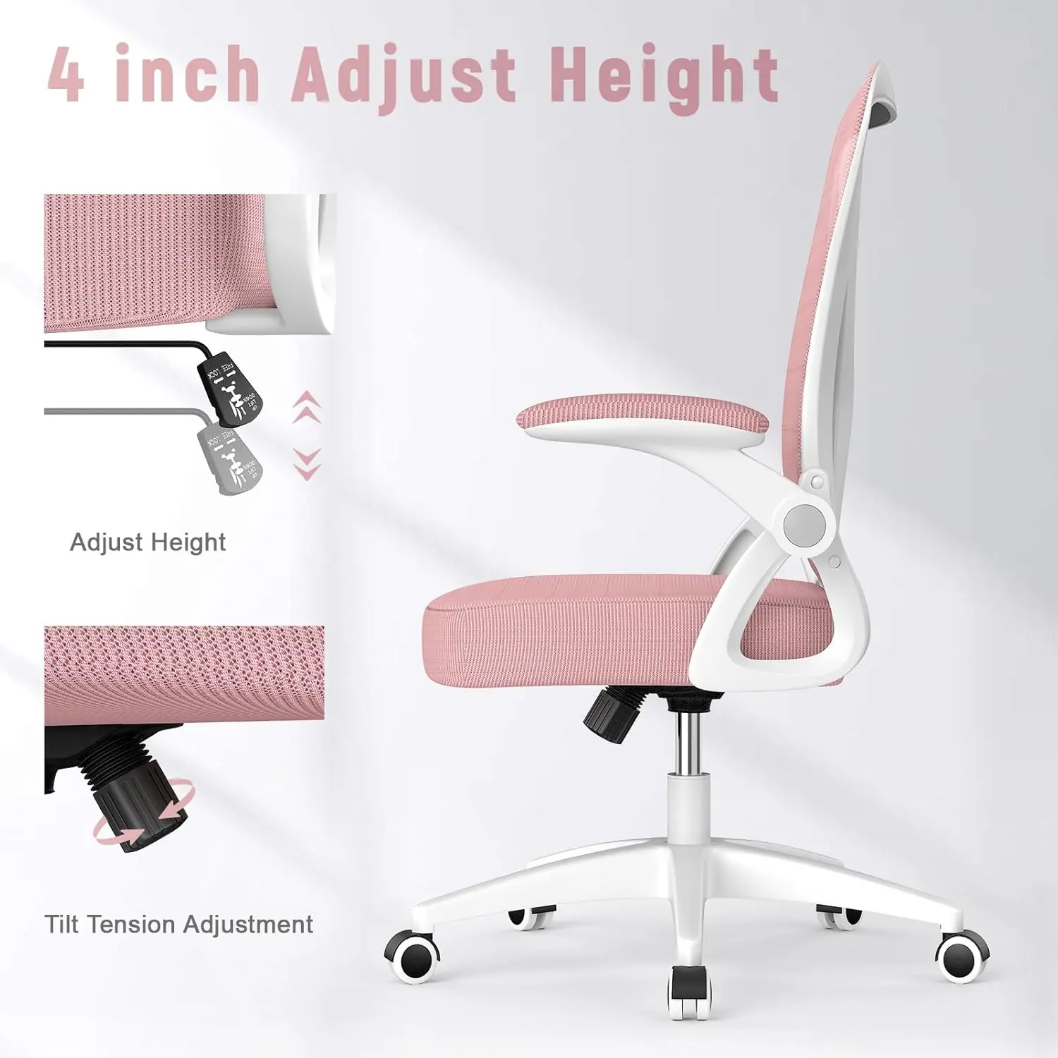 Ergonomic Office Chair, Computer Chair with Adjustable Height, Flip-Up Arms and Lumbar Support, Breathable Mesh Desk Chair for Home Study Working (Without Headrest, Pink)