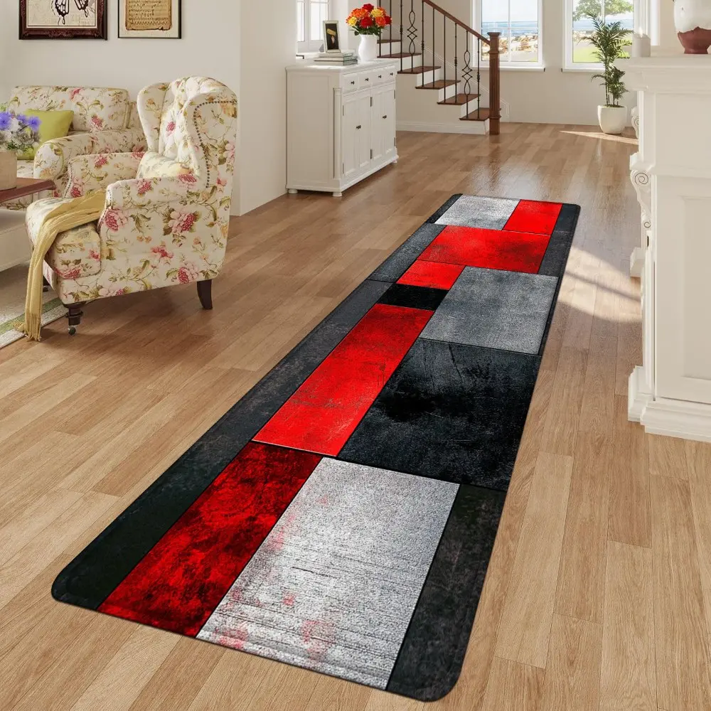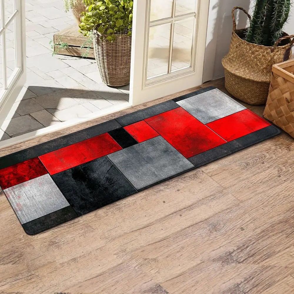 1PC, Red Black Gray Geometric Splicing Patterned strip rugs, home décor, bathroom mats, entryway mats, bathroom non-slip mats, indoor entrance rugs, bedroom bedside mats, kitchen mats, hallway rugs, flannel sponge rugs, hallway runner rugs