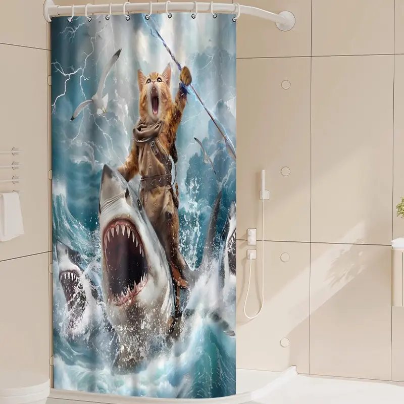 1pc Epic Orange Cat Shark Rider Fantasy Printed Shower Curtains with Plastic Hooks Shower Curtain for Bathtub Bathroom, Suitable for Home and Hotel Machine Washable Bathroom Decor as Best Gifts for Friends and Fantasy Lovers