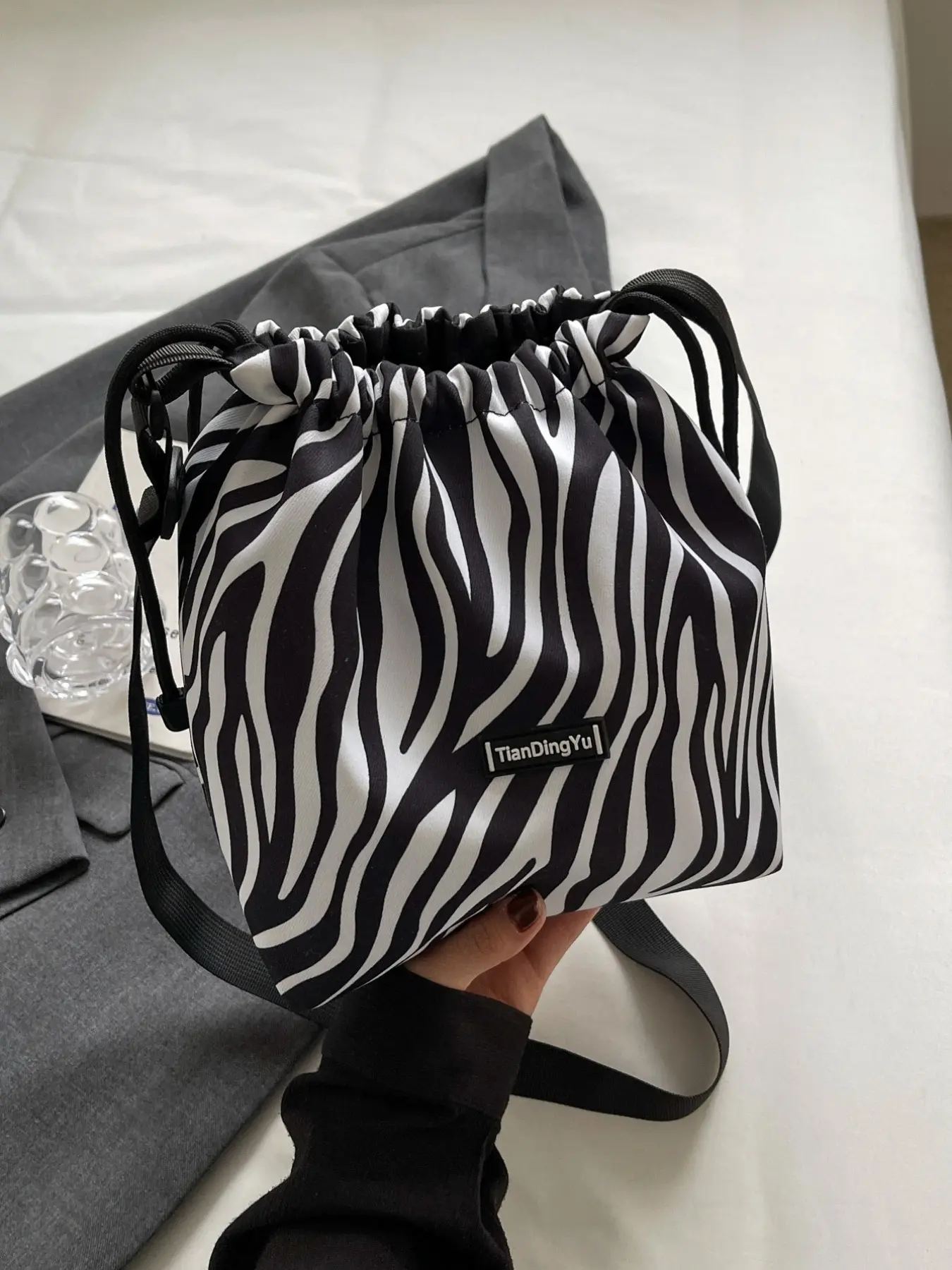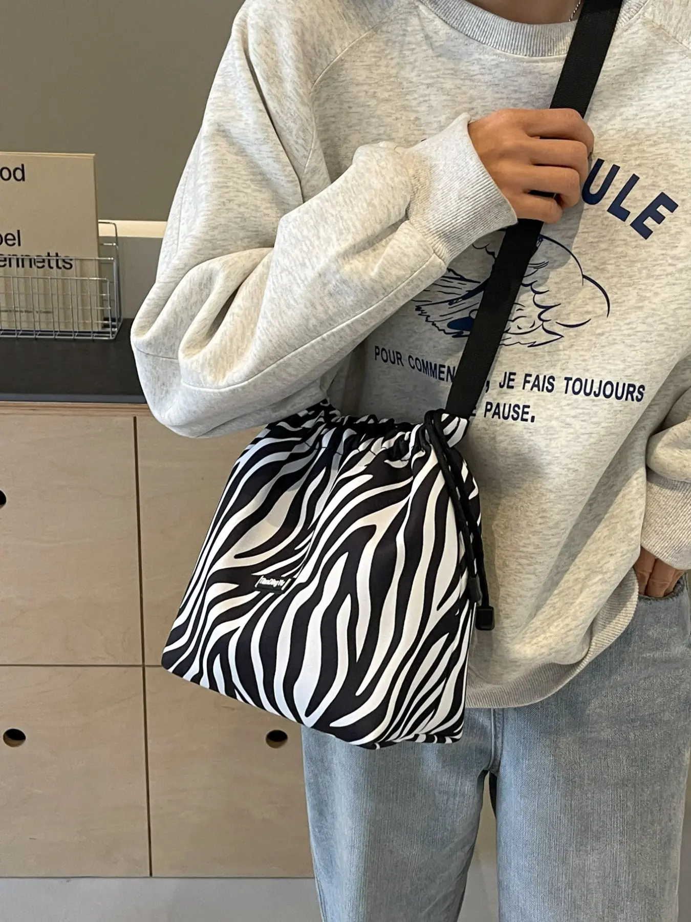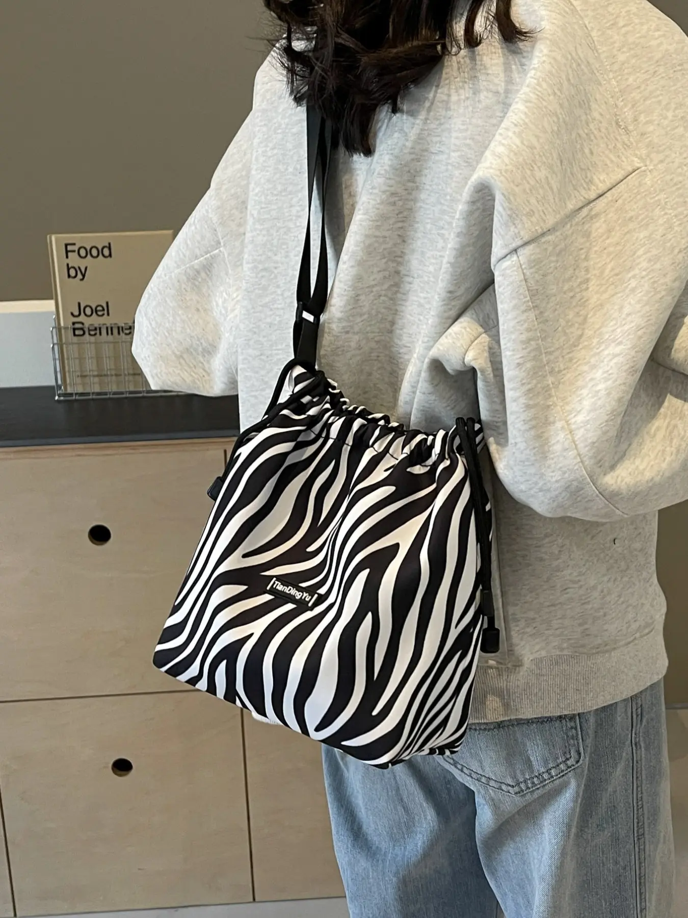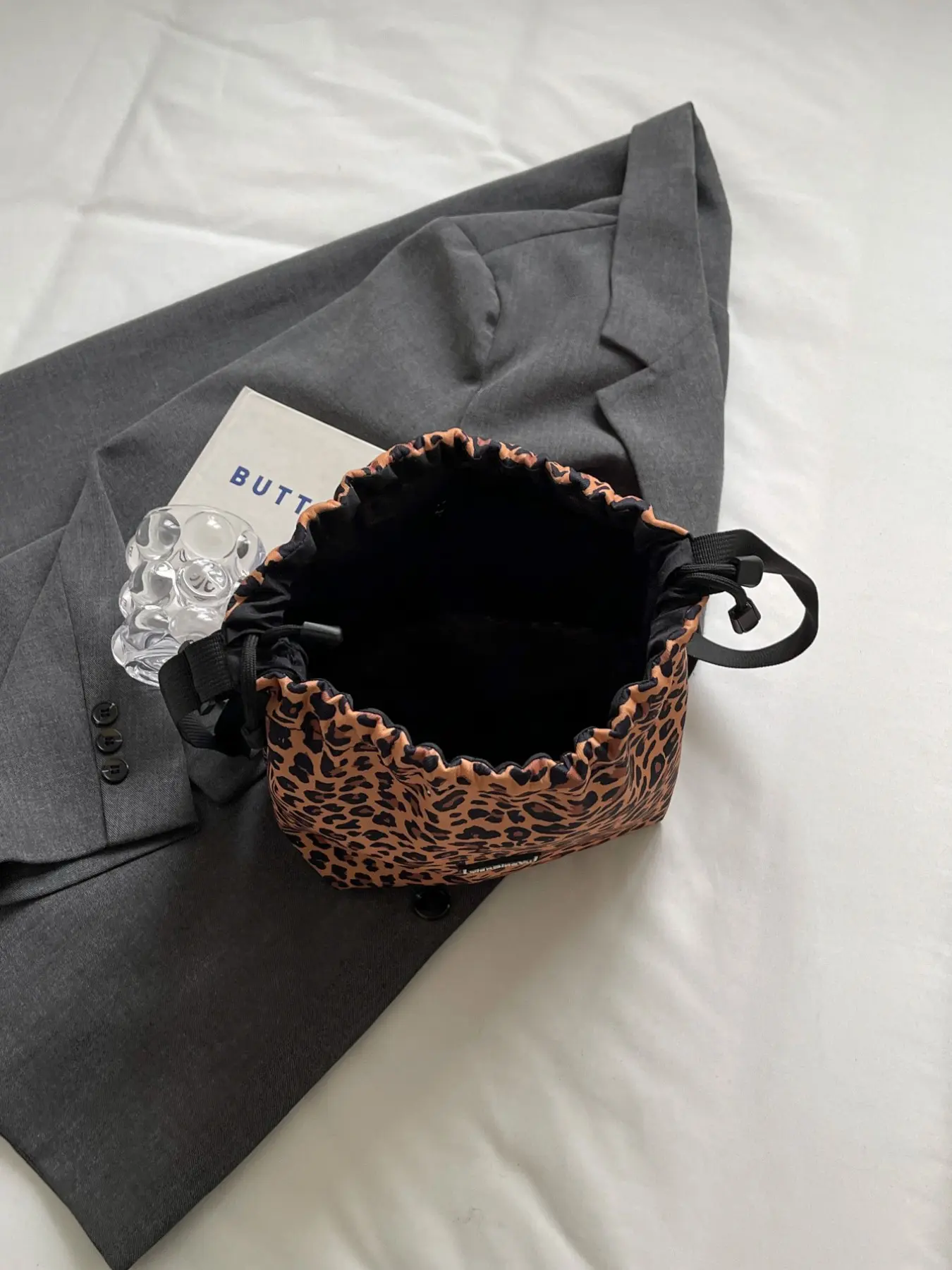Women's Leopard Print Drawstring Bucket Bag, Lightweight Nylon Crossbody Shoulder Purse, Adjustable Strap, Casual All-Season Handbag