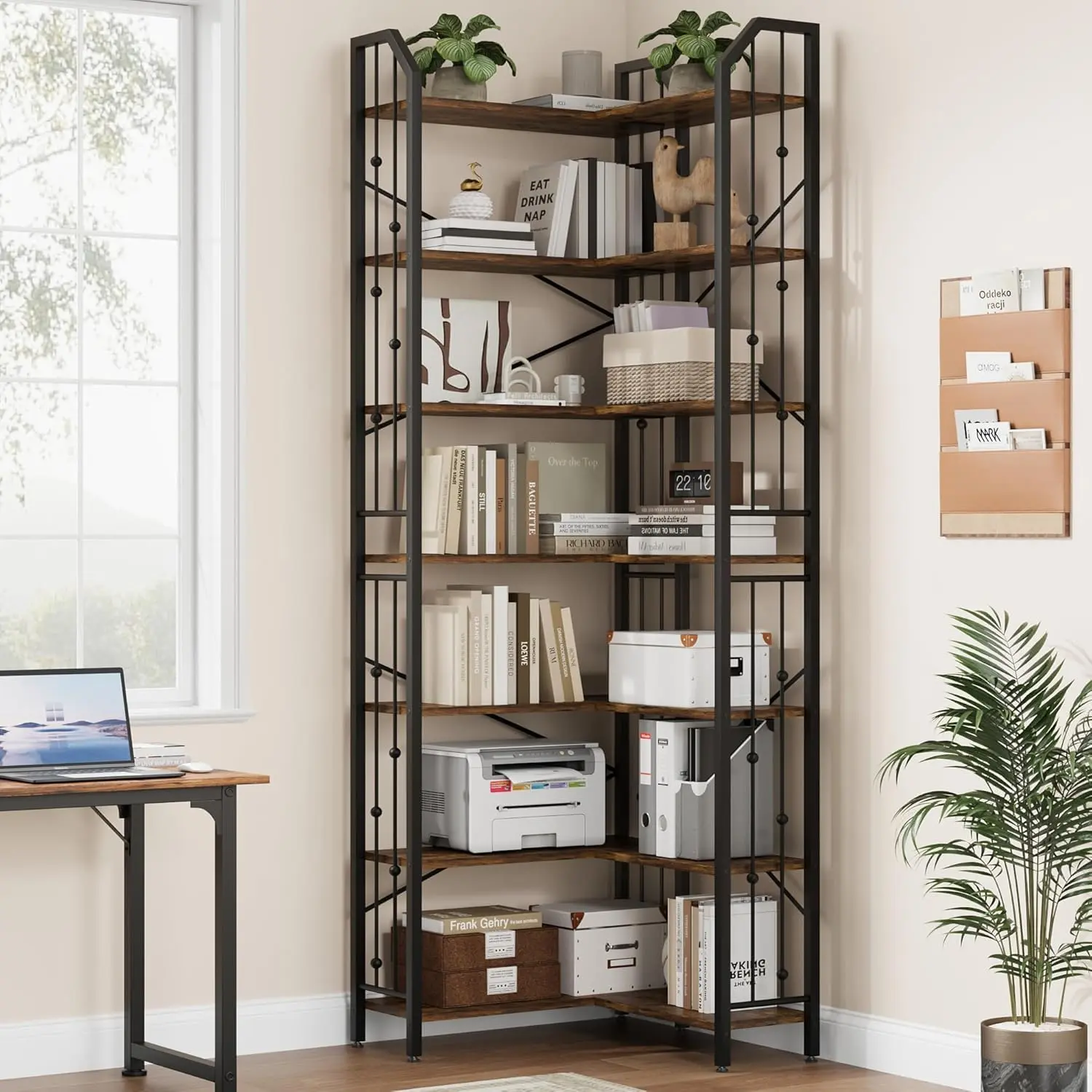 · Spacious Tier Storage: Standing 86 inches tall with a 7-tier open layout, this corner bookshelf offers ample vertical space for books, framed photos, plants, décor pieces, baskets, and display accents, helping keep living rooms, bedrooms, or home offices organized and visually balanced