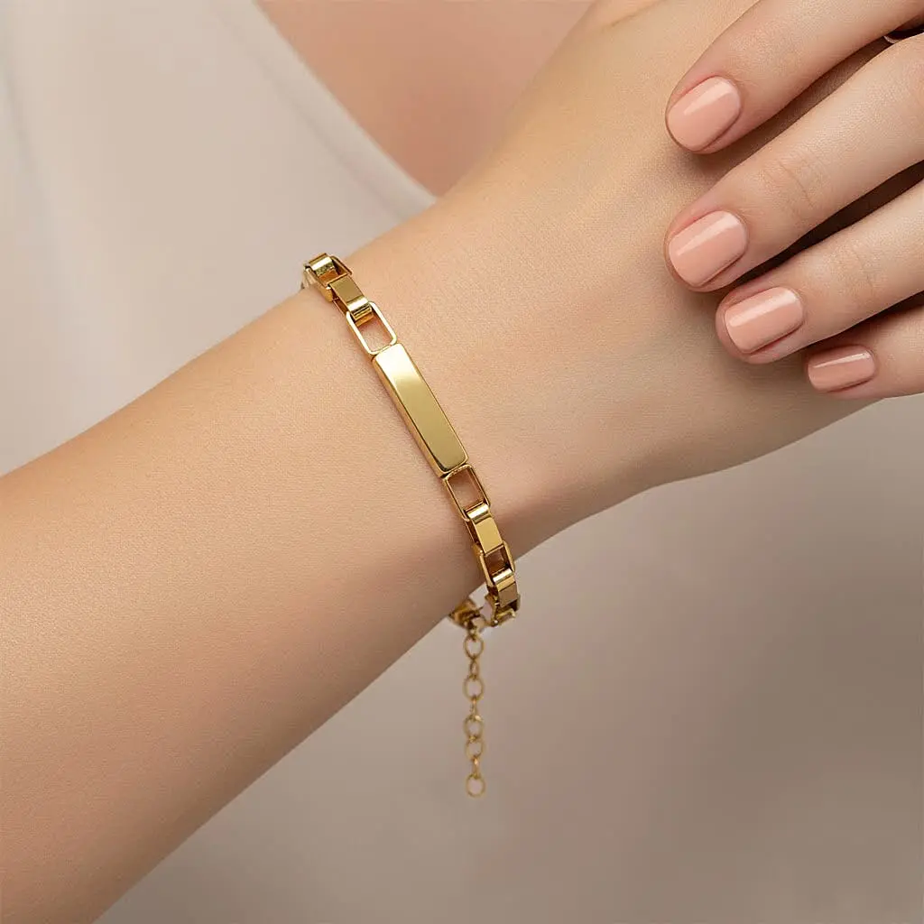 Command attention with this rectangular link chain bracelet in stainless steel. The geometric design and refined finish project your sophisticated personal style. You will appreciate how this durable stainless steel bracelet transitions effortlessly between occasions.Details | style from rectangular link chain | Lasting shine with ION yellow gold plating | Durable comfort in 316L stainless steel | Versatile wear for casual and formal events | Unisex design for bold and confident expression