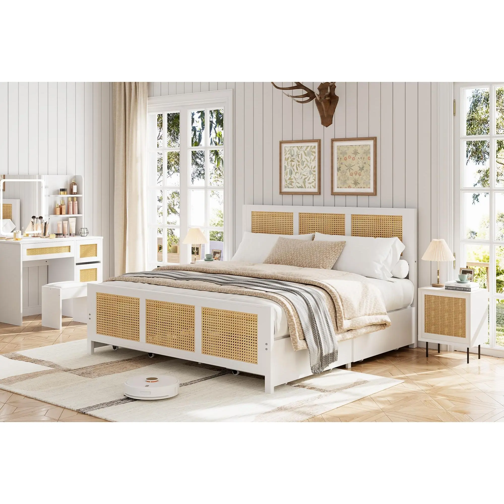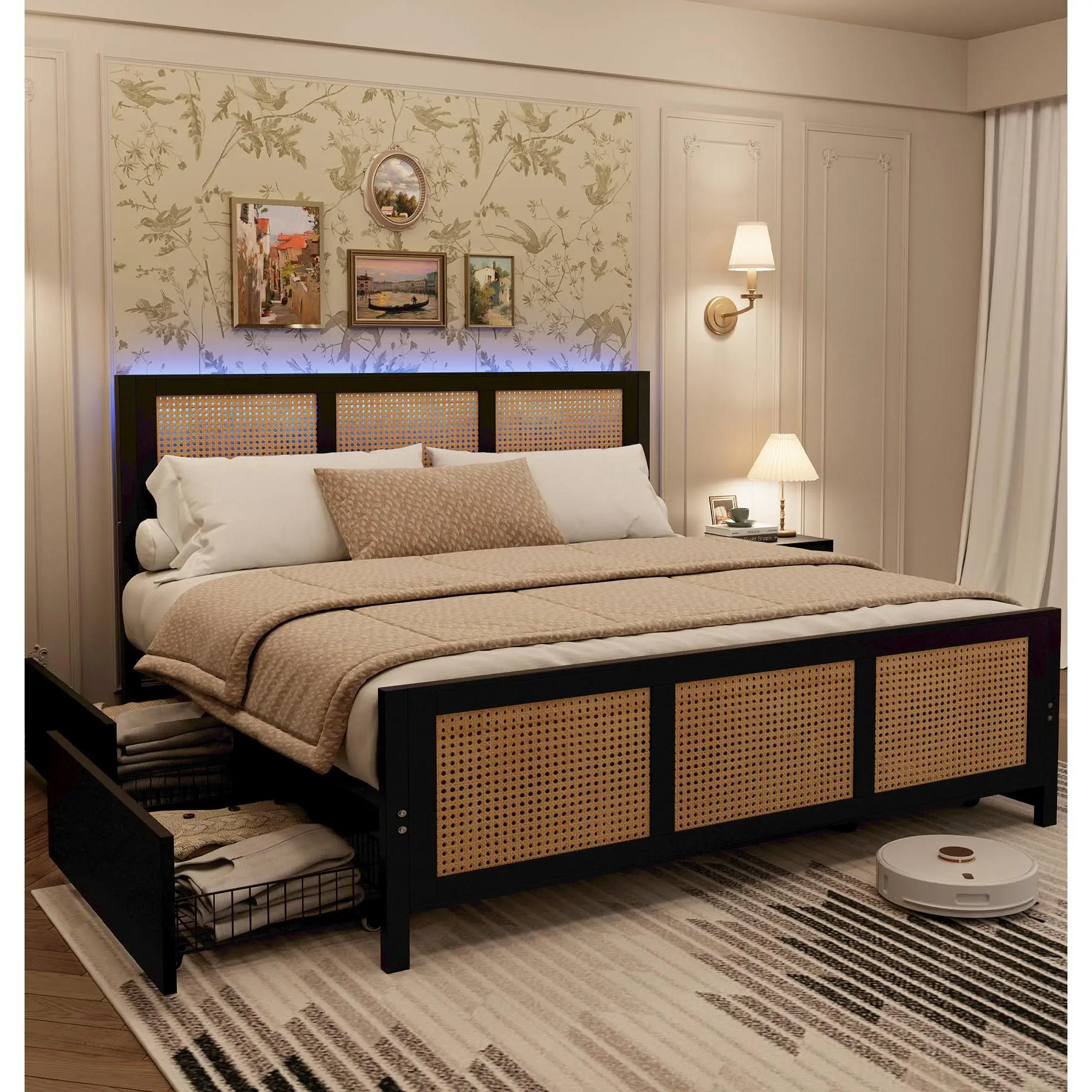 Garvee Boho Rattan Platform Bed Frame with Headboard & 4 Drawers King Queen Full White Black LED Lights Noise Free No Box Spring Needed