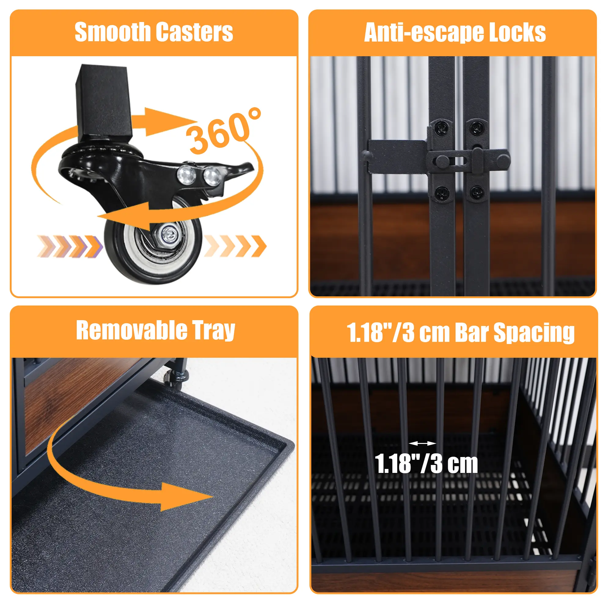 Built-In Practical Details for Daily Use : Each whelping box includes smooth-rolling wheels for movement, a pull-out bottom tray for convenient cleaning, secure door latches for added safety, and well-spaced bars for full airflow and visibility. The rust-resistant painted iron tube frame, MDF panels, and plastic floor create a practical enclosure that is easy to manage for breeding, recovery, or nursery care.