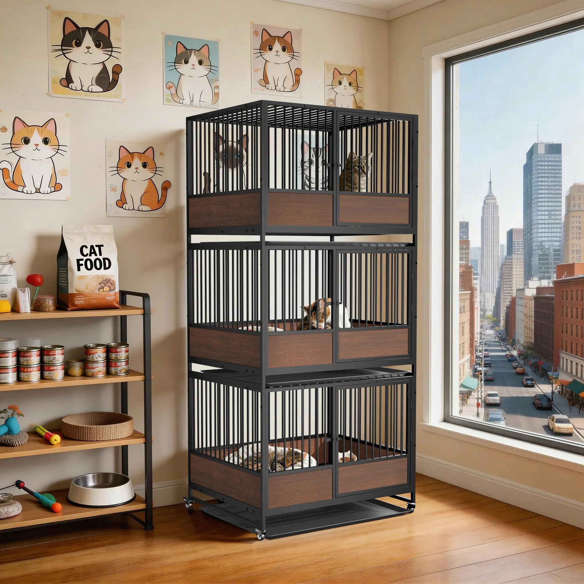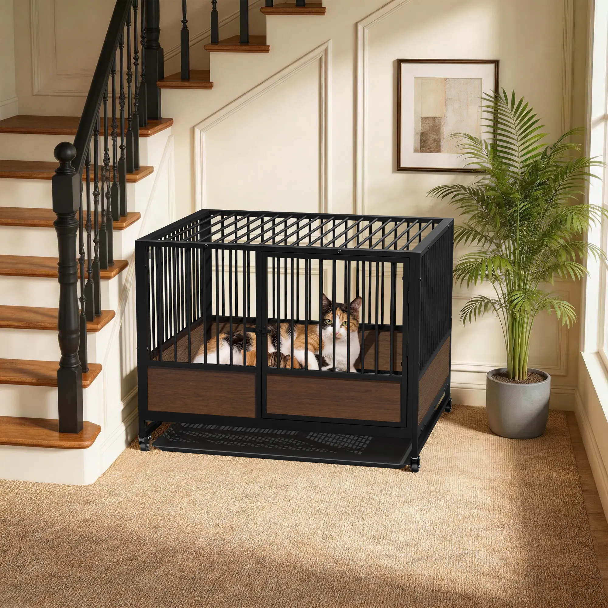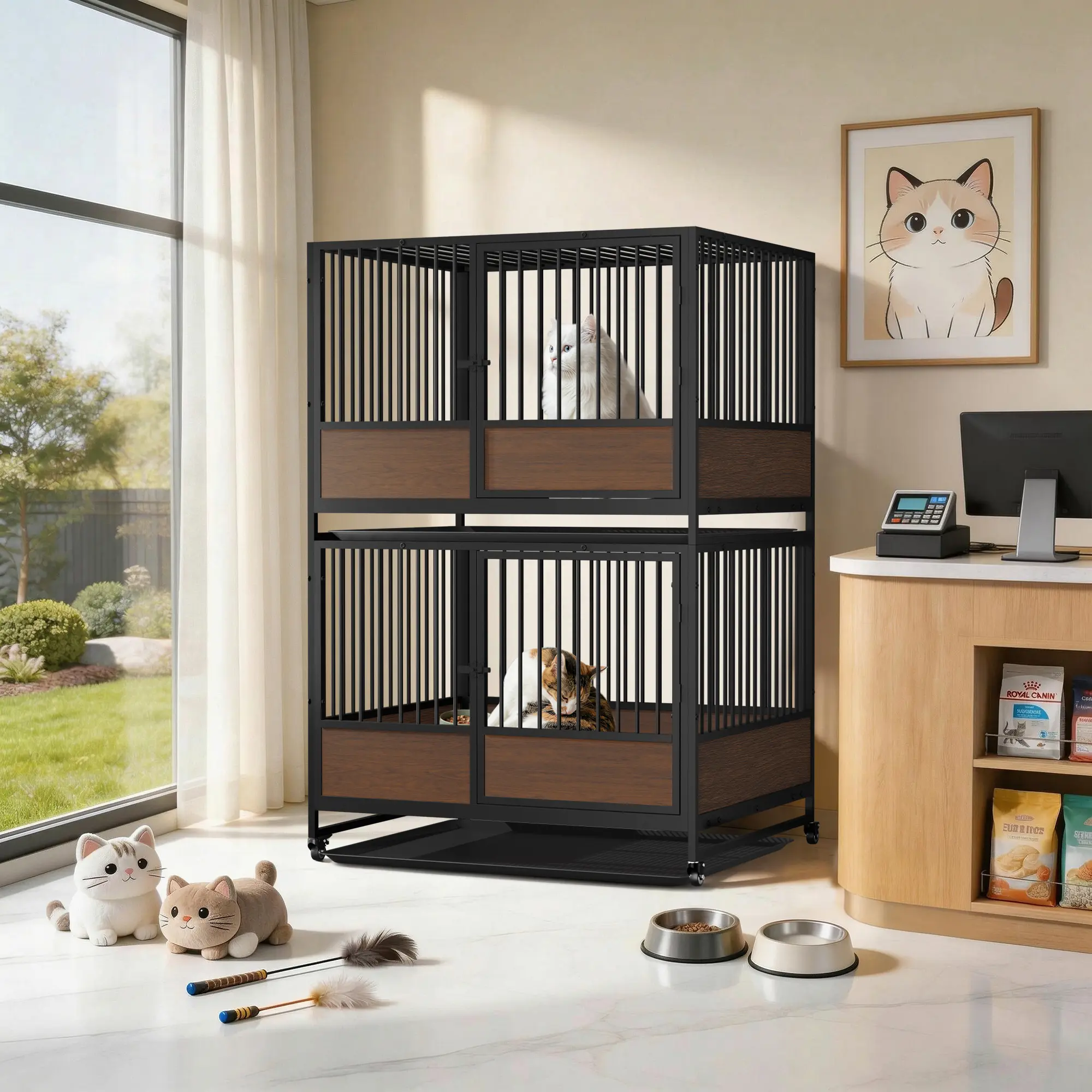 MDF Bottom Surround Helps Protect Newborns : The lower sides are enclosed with wood-grain MDF panels around the pen base to help prevent newborn kittens from slipping or falling out through the bars. This added barrier creates a safer nesting area for mothers and babies, making the enclosure especially useful during birthing and nursing stages