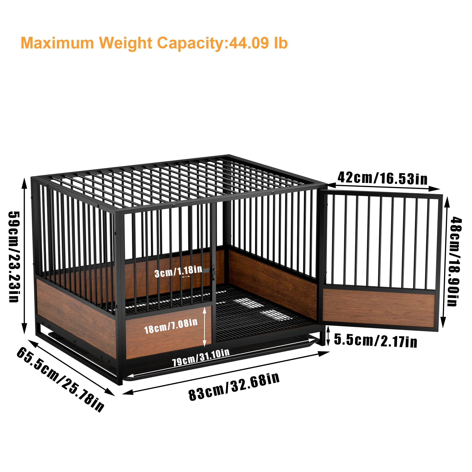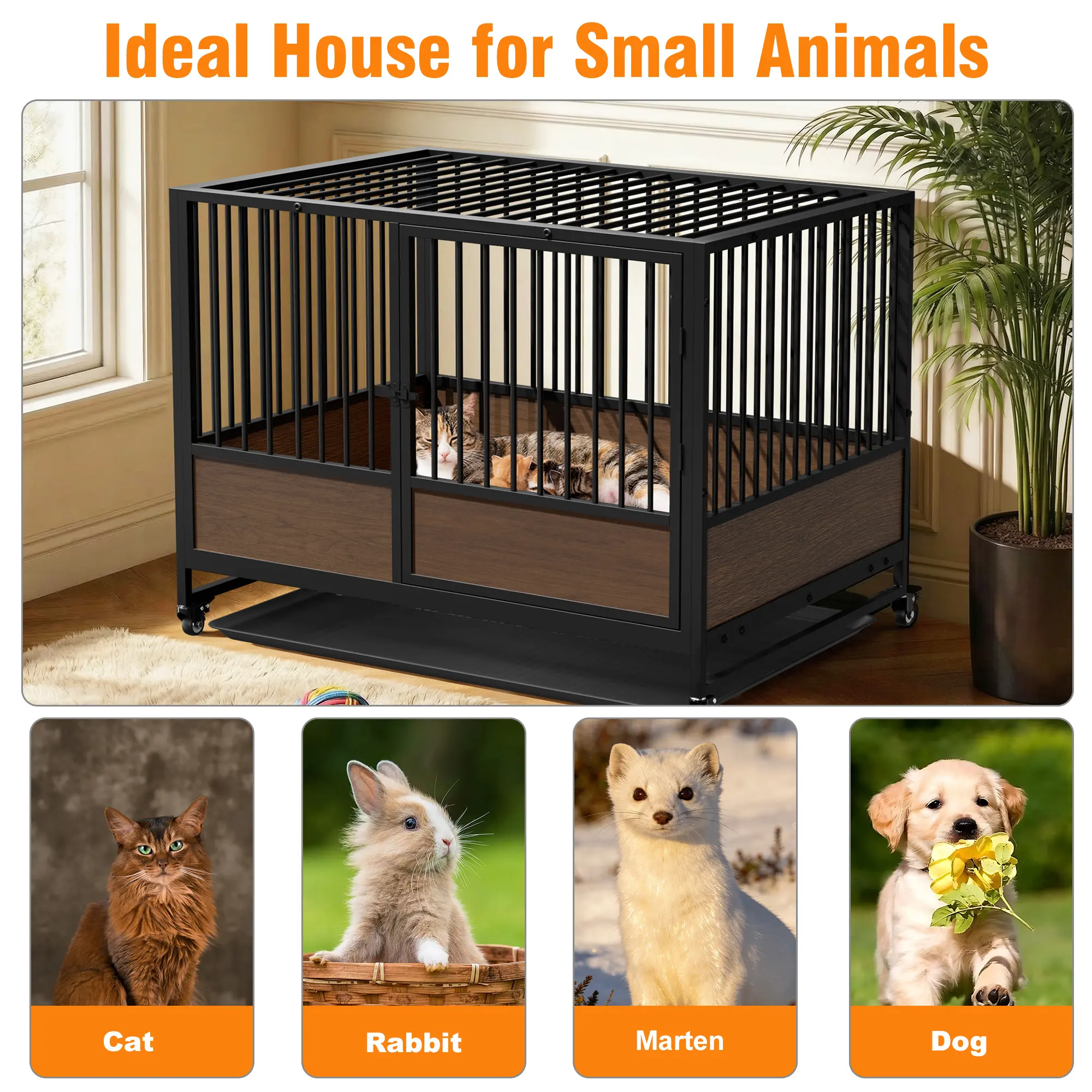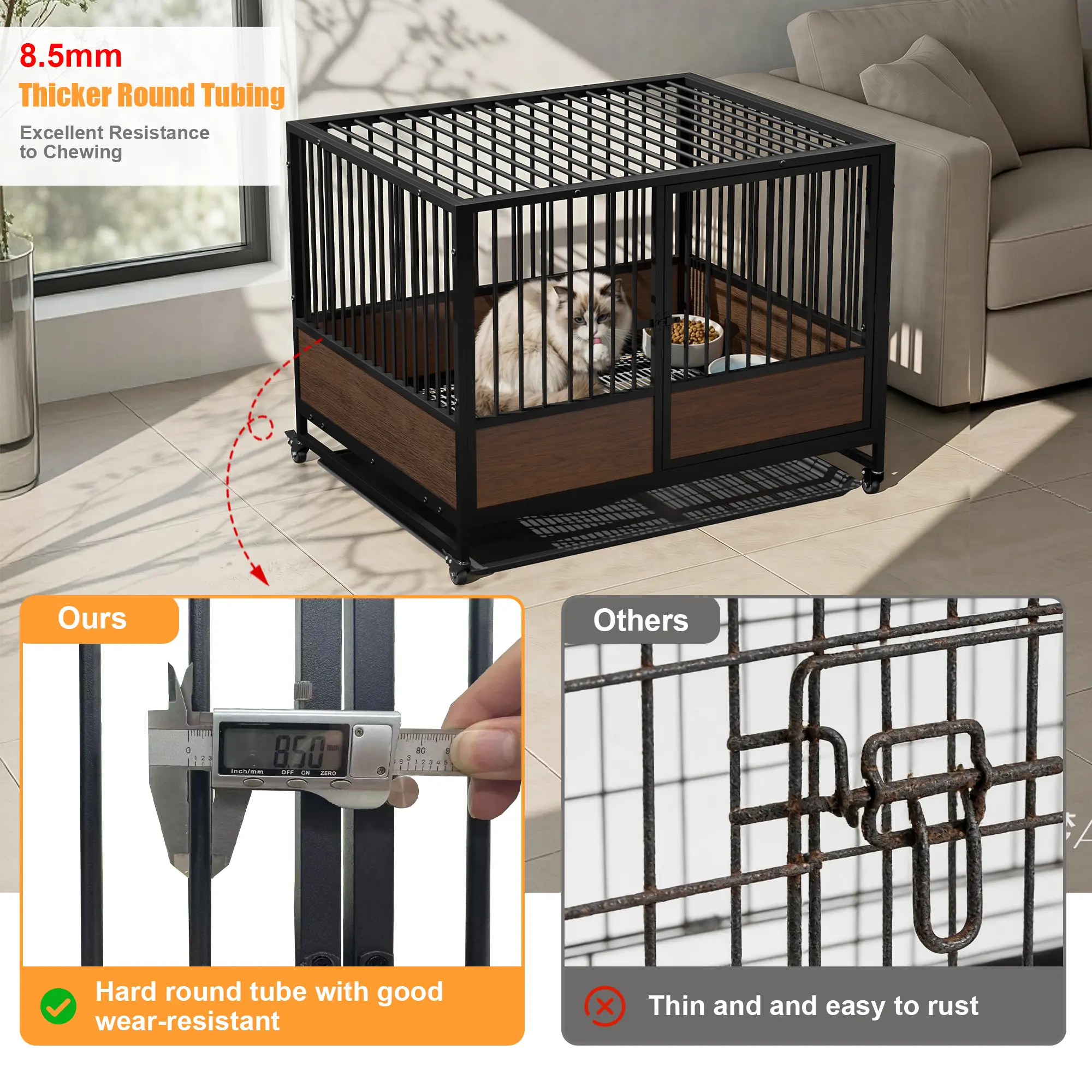 MDF Bottom Surround Helps Protect Newborns : The lower sides are enclosed with wood-grain MDF panels around the pen base to help prevent newborn kittens from slipping or falling out through the bars. This added barrier creates a safer nesting area for mothers and babies, making the enclosure especially useful during birthing and nursing stages