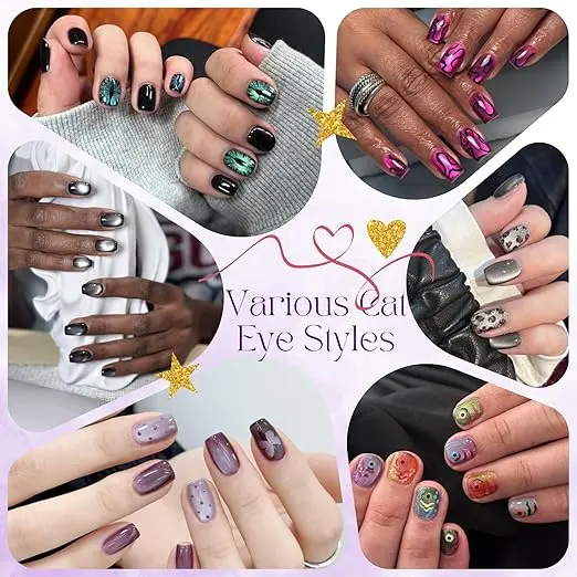 ·Strong Cat Eye Gel Nail Polish Magnet for Instant Effect: With ultra-strong magnetic cores, this cat eye nail magnet captures metallic particles instantly. Achieve sharp, salon-level lines in seconds-no blur, no smudge. Perfect plump effect every time.