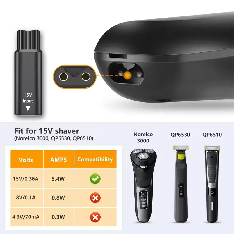 【 Type-C Shaver Adapter】 With this 15V Type-C Shaver Adapter Charging Converter, you are able to charge your Philips Norelco OneBlade shaver by converting traditional USB-C power sources into a suitable power input, eliminating the need for a separate charger cord. Simply plug it into any USB-C port for efficient charging. Note: Package only includes 1x adapter.