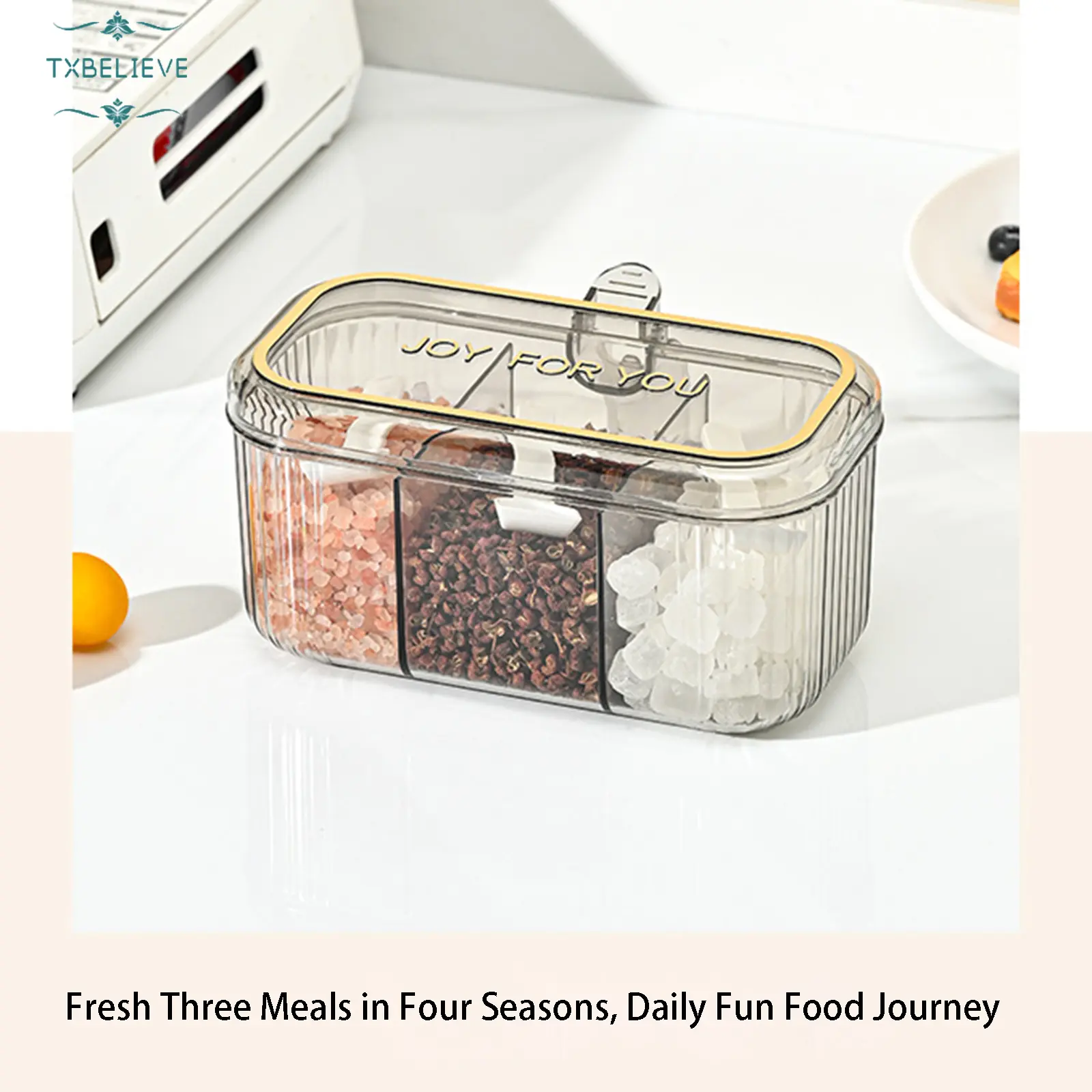 Kitchen 3-Compartment Seasoning Box with Lid — Simple & Fresh Home-Use Divided Container for Salt, MSG, Chicken Essence, and Spices