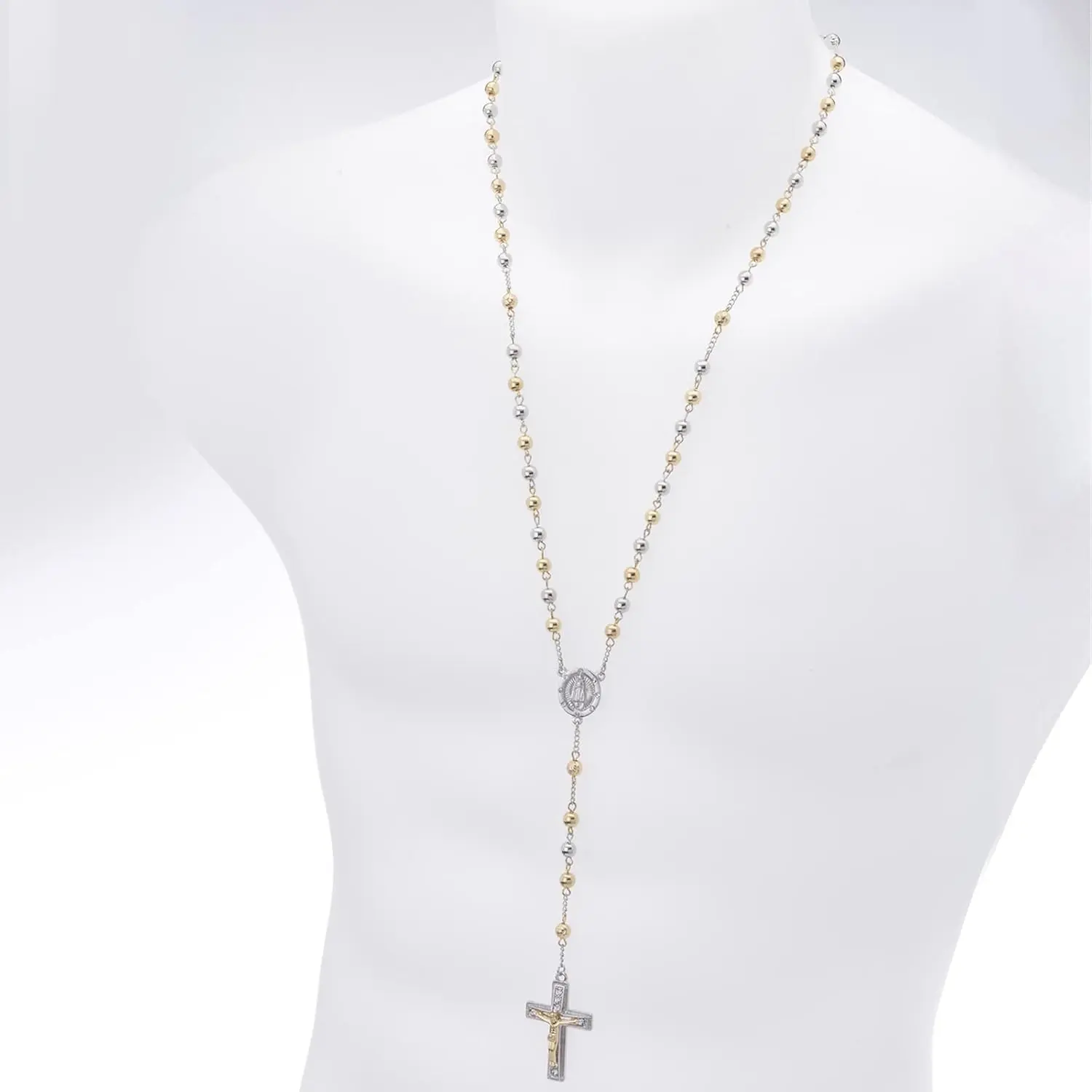 This Rosary gold silver black rose gold tone Sergio Jesus Cross 28" necklace features a ball chain design. The necklace is crafted from brass, ensuring a classic and timeless look. The absence of gemstones keeps the design simple and elegant. Perfect for those who appreciate a minimalist yet meaningful accessory.