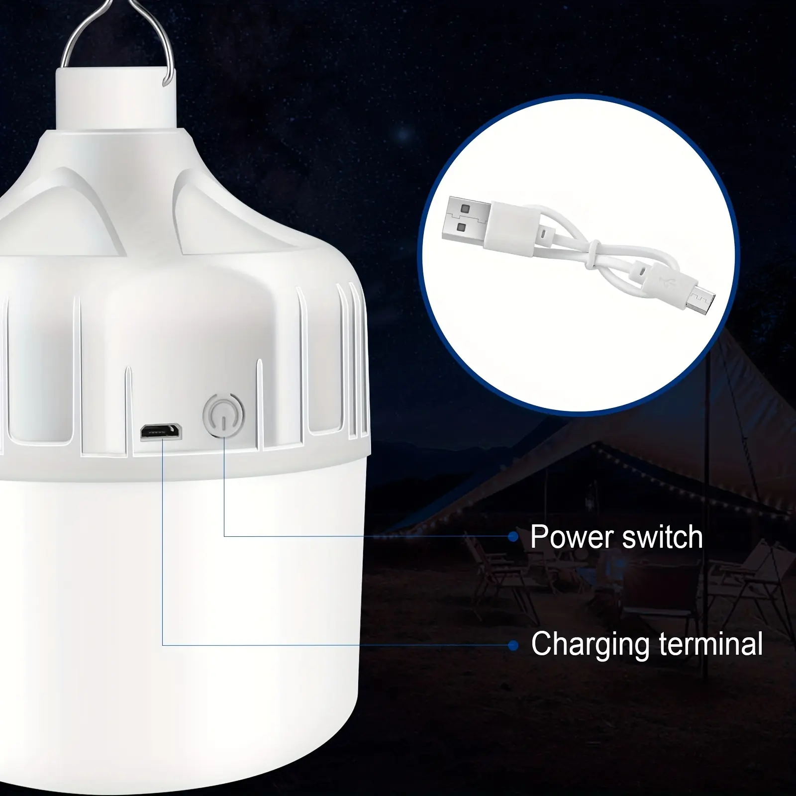 1 USB-Rechargeable LED Bulb - Portable Flashlight & Night Light with Hook, High Brightness, Low Voltage for /Camping/Emergency, USB- Light Suitable for Outdoor, Parties, Gifts